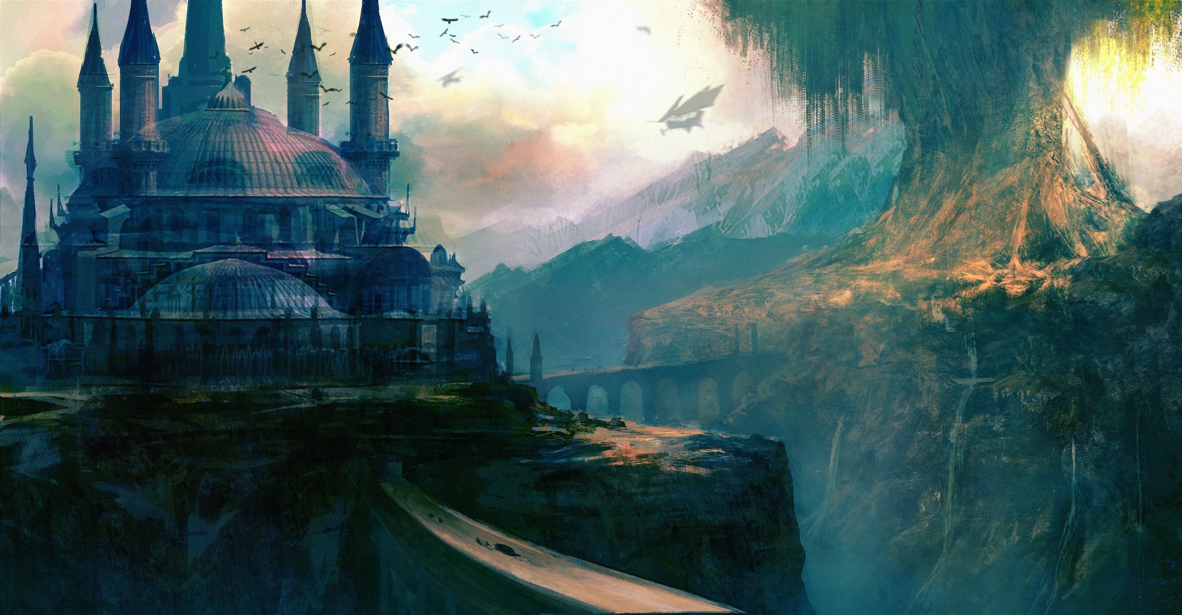 Tagi:sztuka, fikcja, drzewo, budynek, statek, góry, niebo, chmury, królestwo