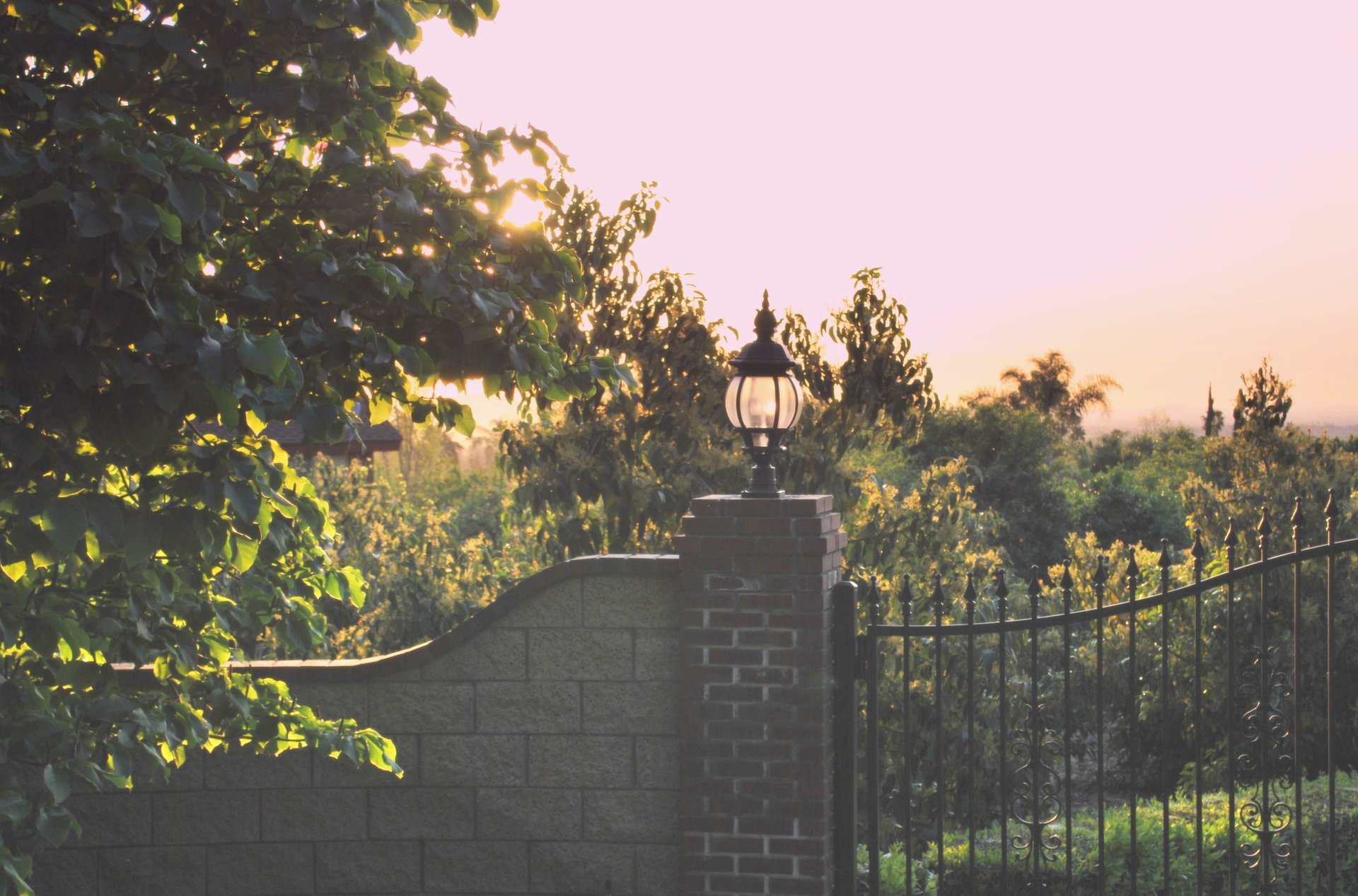 poranek słońce drzewa ogrodzenie latarnia nastrój