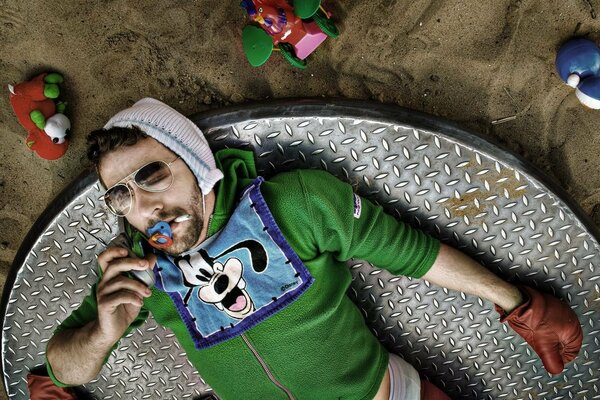Mężczyzna na karuzeli pali papierosa