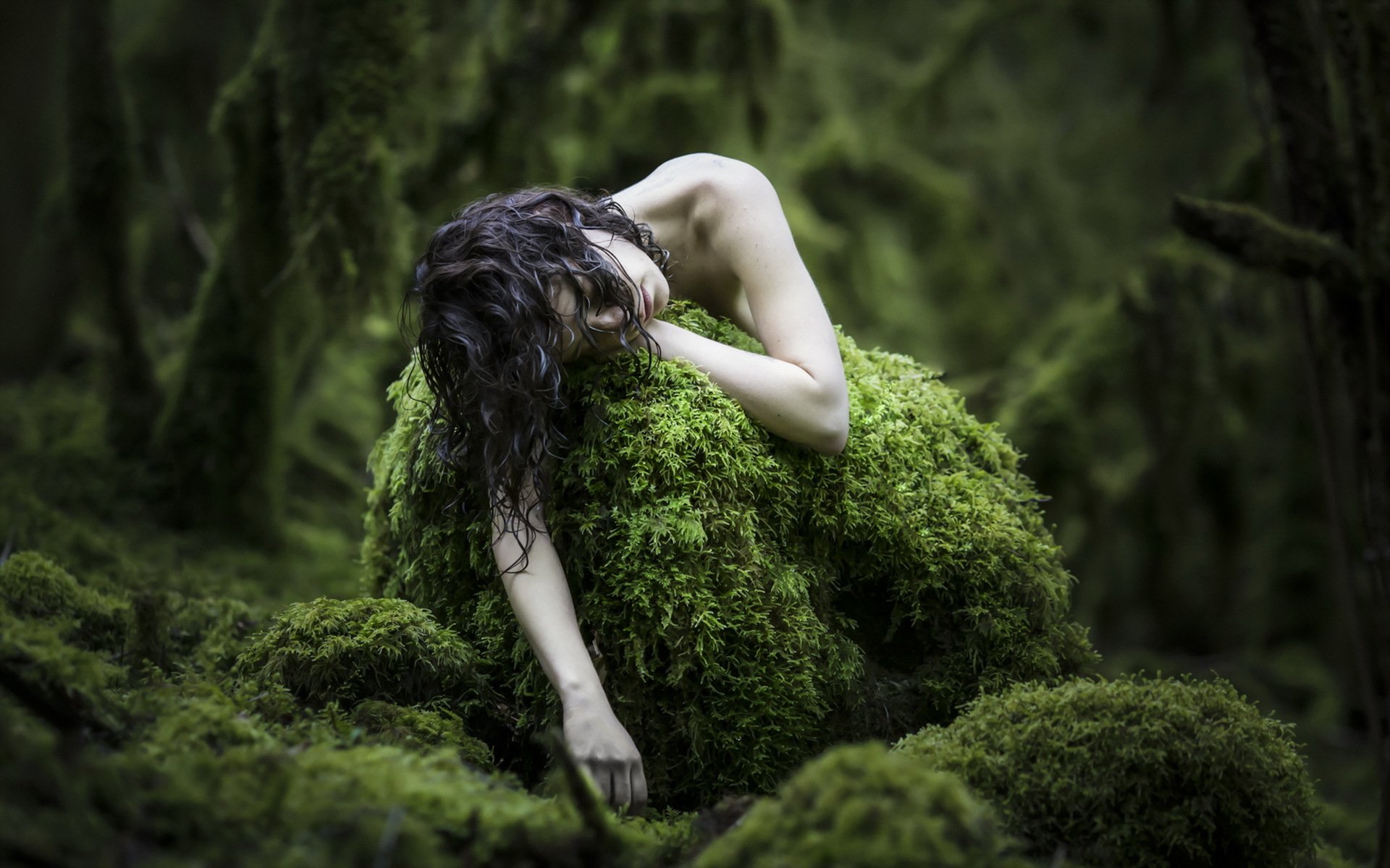 Blada dziewczyna w lesie na mchu - tapety na telefon