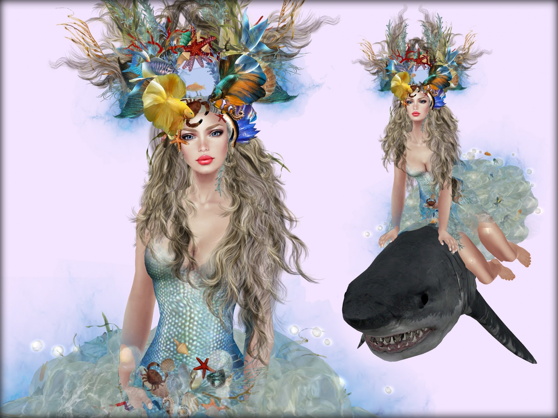 Choinka z niebiesko-żółtymi girlandami i dom na skalistych wyspach w chmurach w stylu fantasyChoinka z niebiesko-żółtymi girlandami i dom na skalistych wyspach w chmurach w stylu fantasy