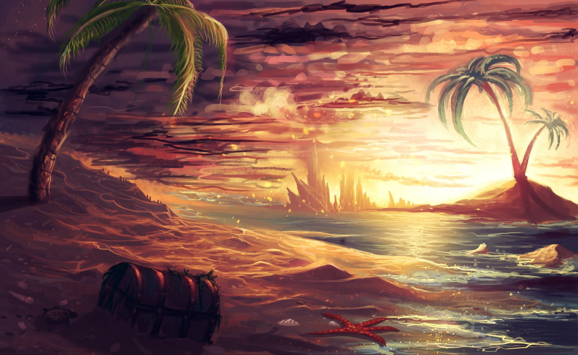 Długa łódź na spokojnej powierzchni wody na tle palm i zachodu słońcaDługa łódź na spokojnej powierzchni wody na tle palm i zachodu Słońca