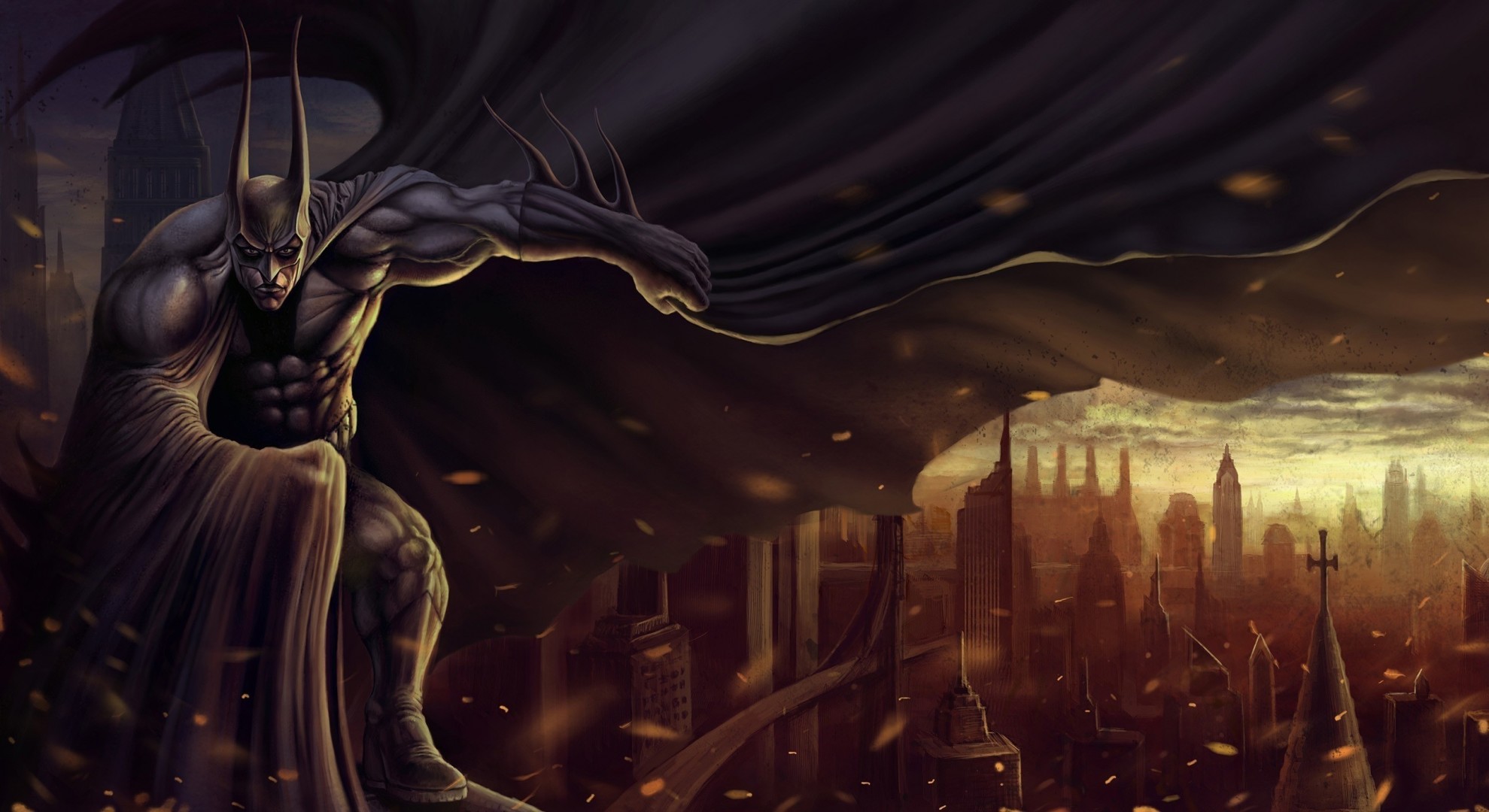 Sztuka Jokera na tle telewizorów stojących na maskach Batmana
