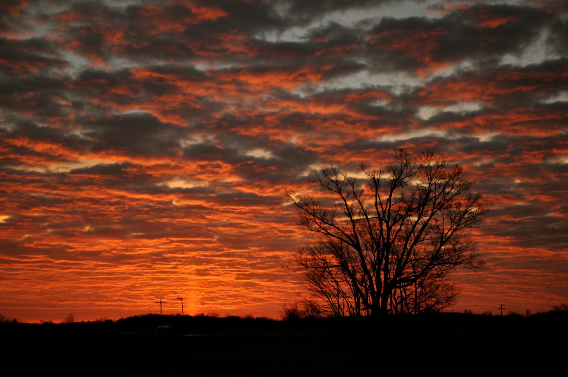 Sylwetka drzewa i trawy na tle czerwonego zachodu Słońca