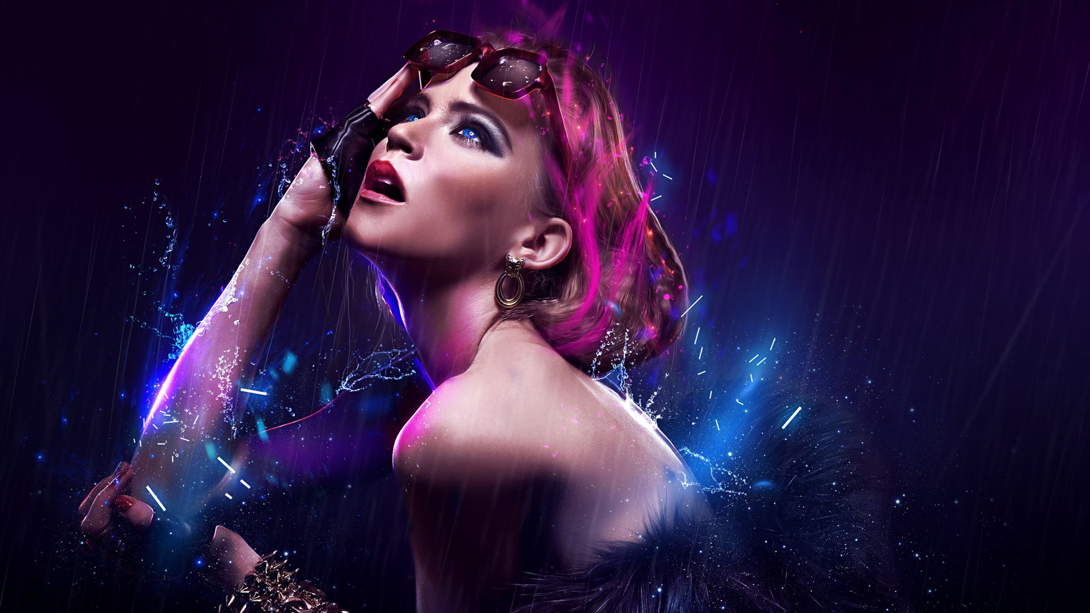 Gimnastyczka w fioletowym body szybowała nad ziemią w różowym i fioletowym blaskuGimnastyczka w fioletowym body szybowała nad ziemią w różowym i fioletowym blasku