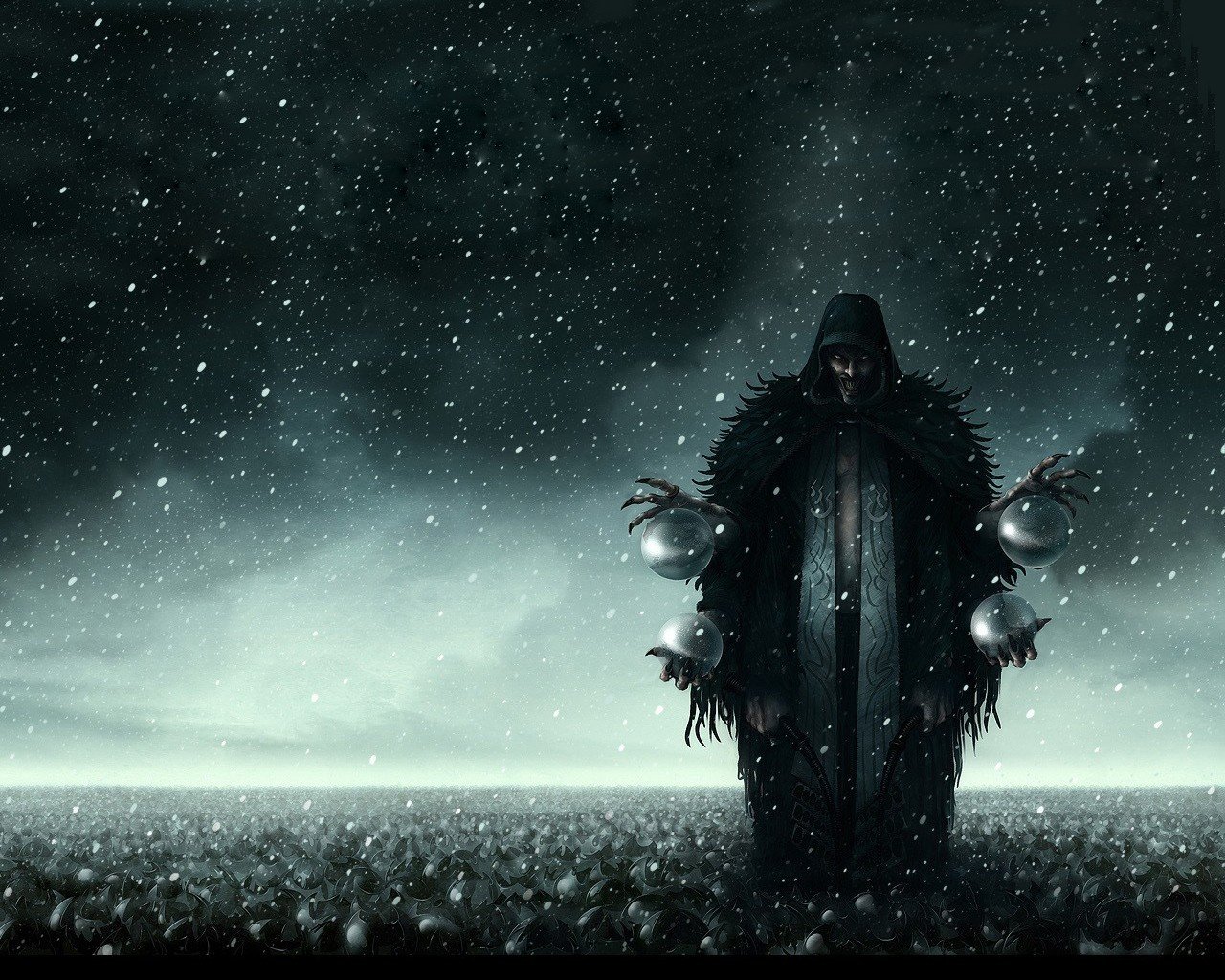 Czarny charakter trzyma piłki w czterech rękach i pada śnieg