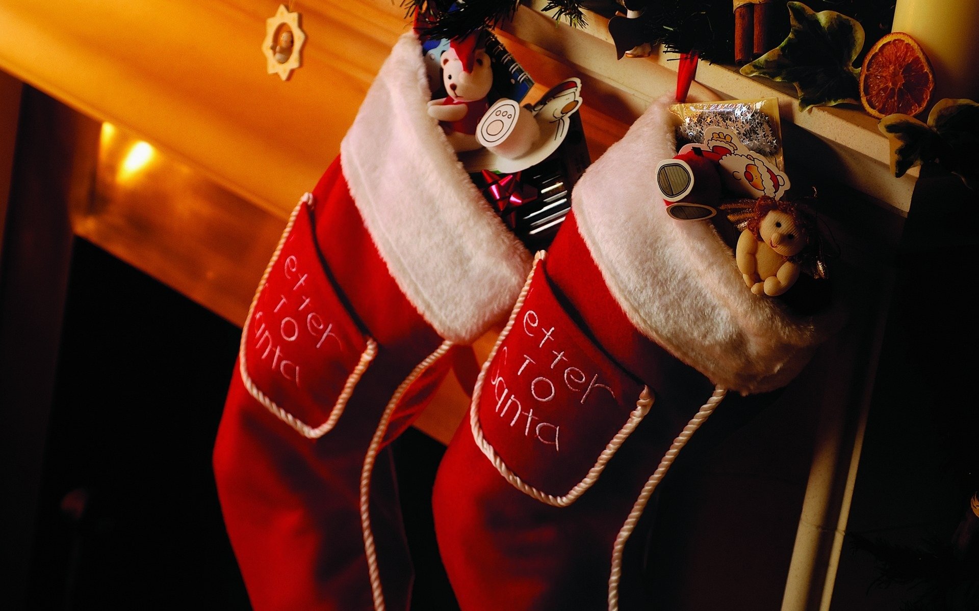 Dwie skarpetki na kominku z prezentami
