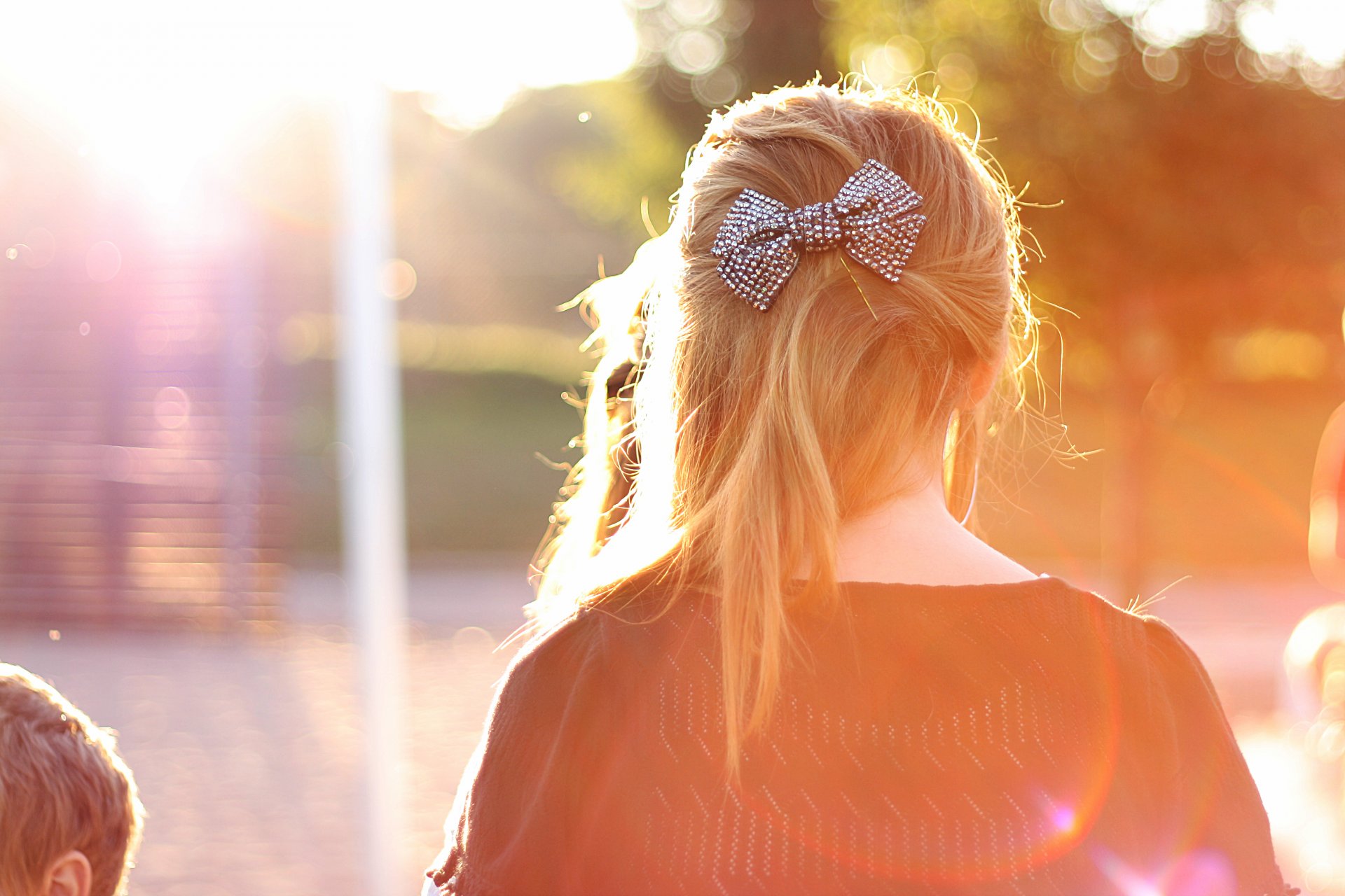 Fryzura dziewczyny z kokardką w promieniach słońcaFryzura dziewczyny z kokardką w promieniach słońca