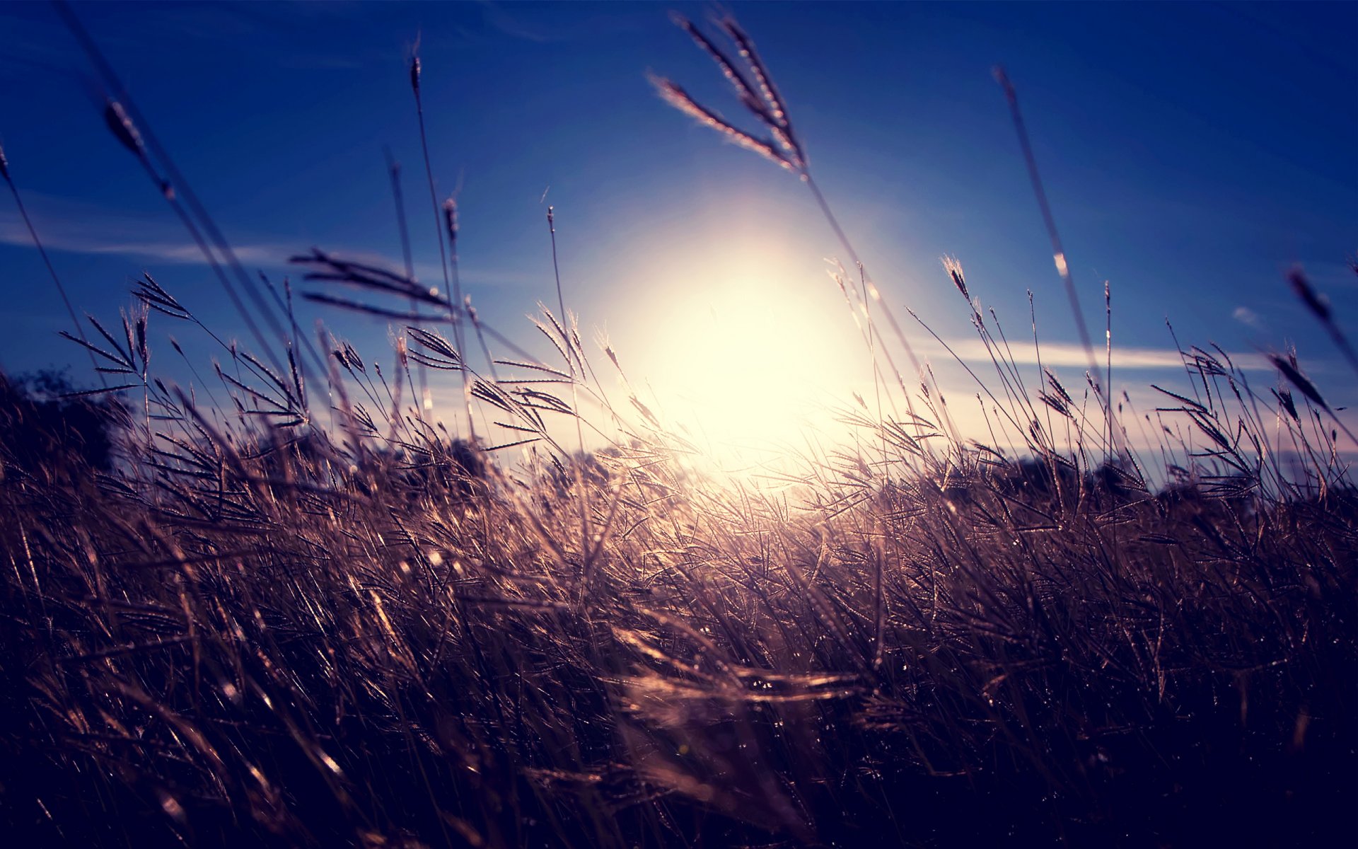 Zachód słońca w polu suchej trawy na tle błękitnego niebaZachód Słońca w polu suchej trawy na tle błękitnego nieba