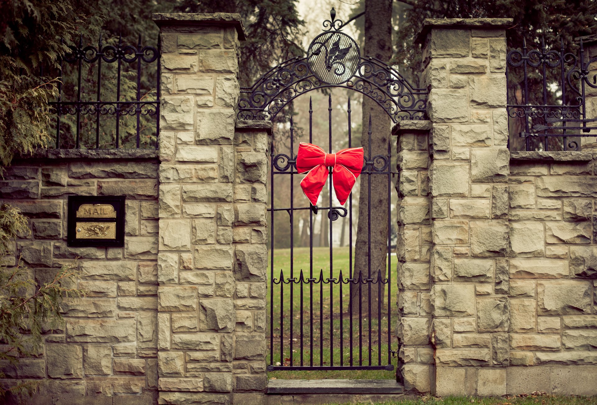 Zielony prezent z czerwoną wstążką w śniegu na dachu domu