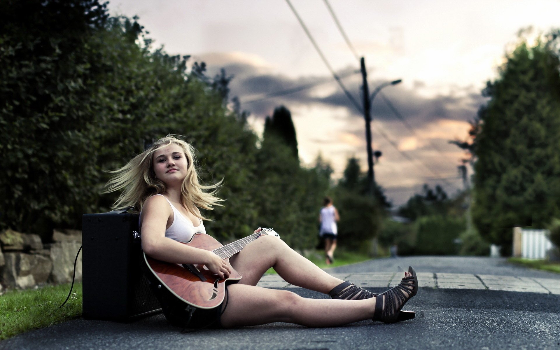 Dziewczyna z długimi włosami i bransoletkami na ramieniu z gitarąDziewczyna z długimi włosami i bransoletkami na ramieniu z gitarą