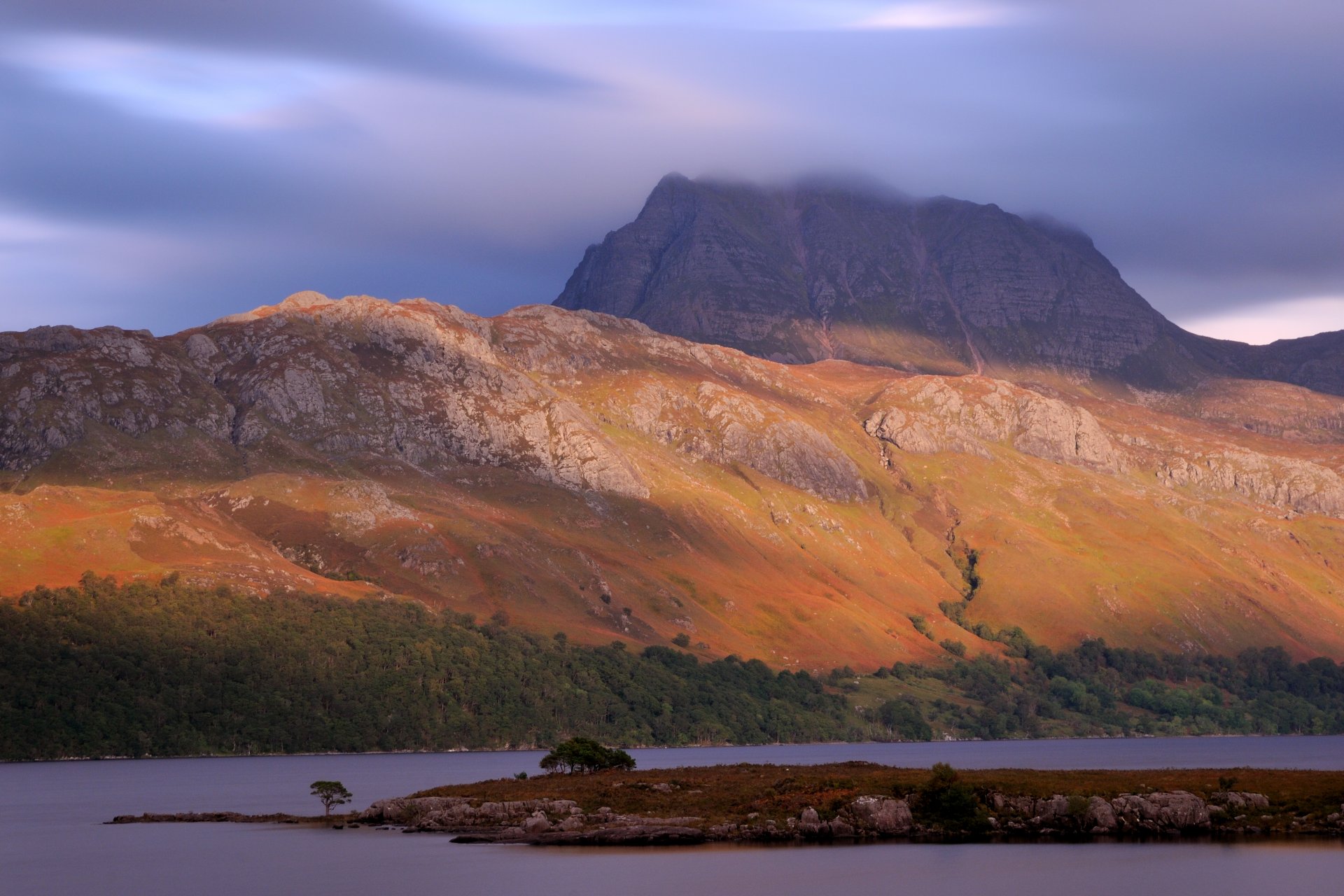 Zachód słońca nad jeziorem i górami w wielkiej brytaniiZachód słońca nad jeziorem i górami w Wielkiej Brytanii