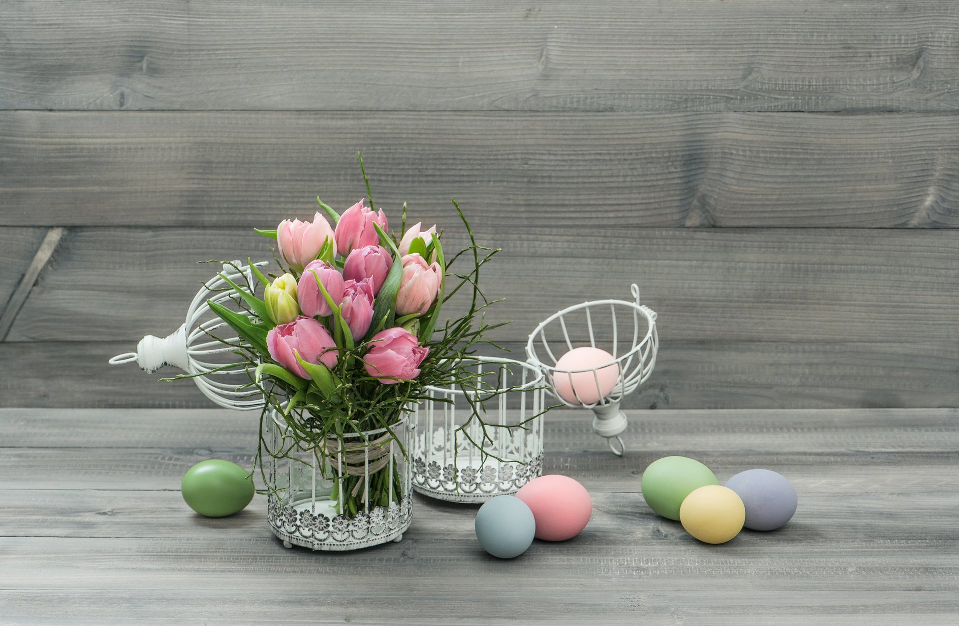 Wielkanocne kosze z jajkami. Wiosenne kwiaty. Hiacynty i żonkile