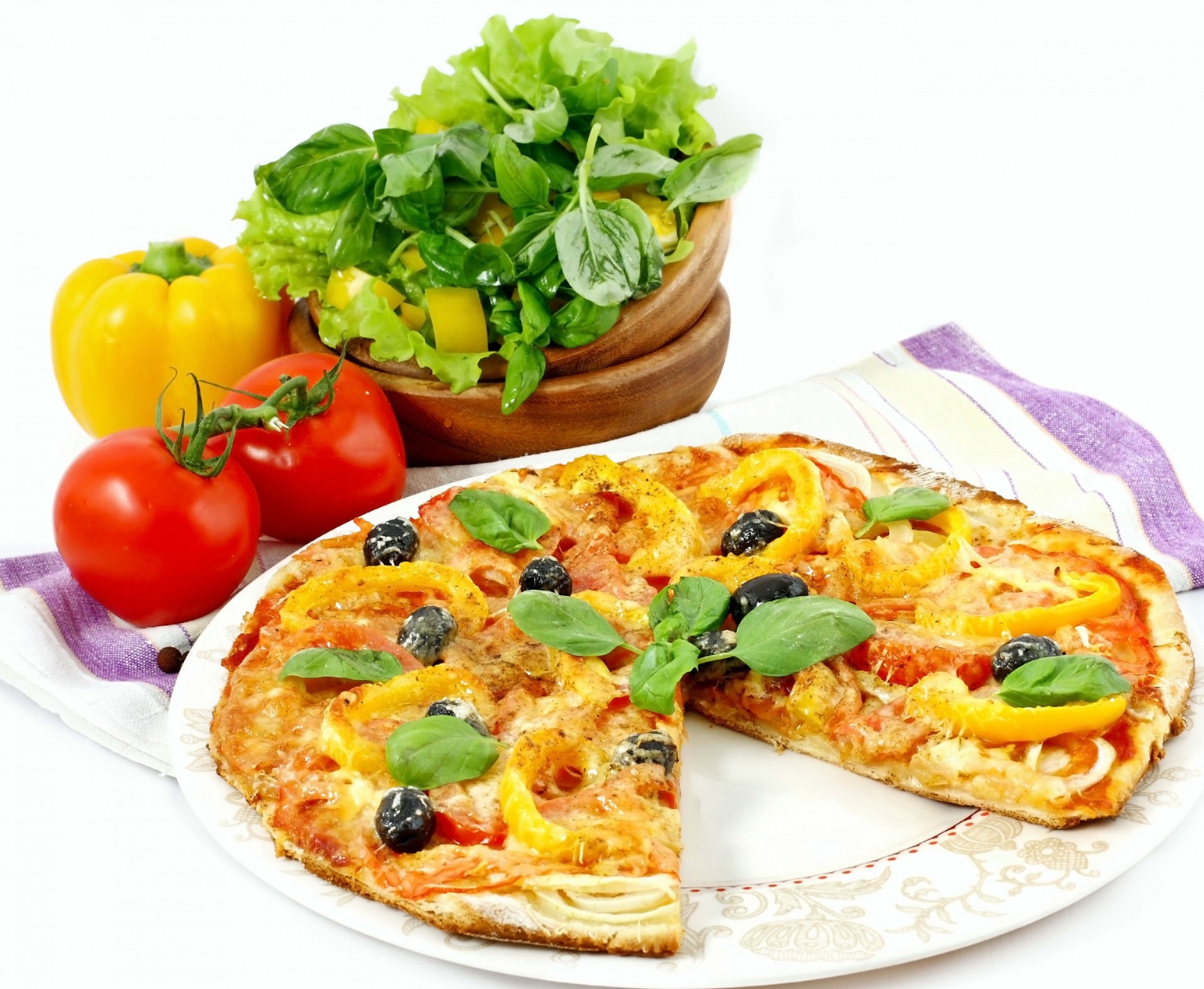 Na białym tle leży pizza z pysznymi warzywami