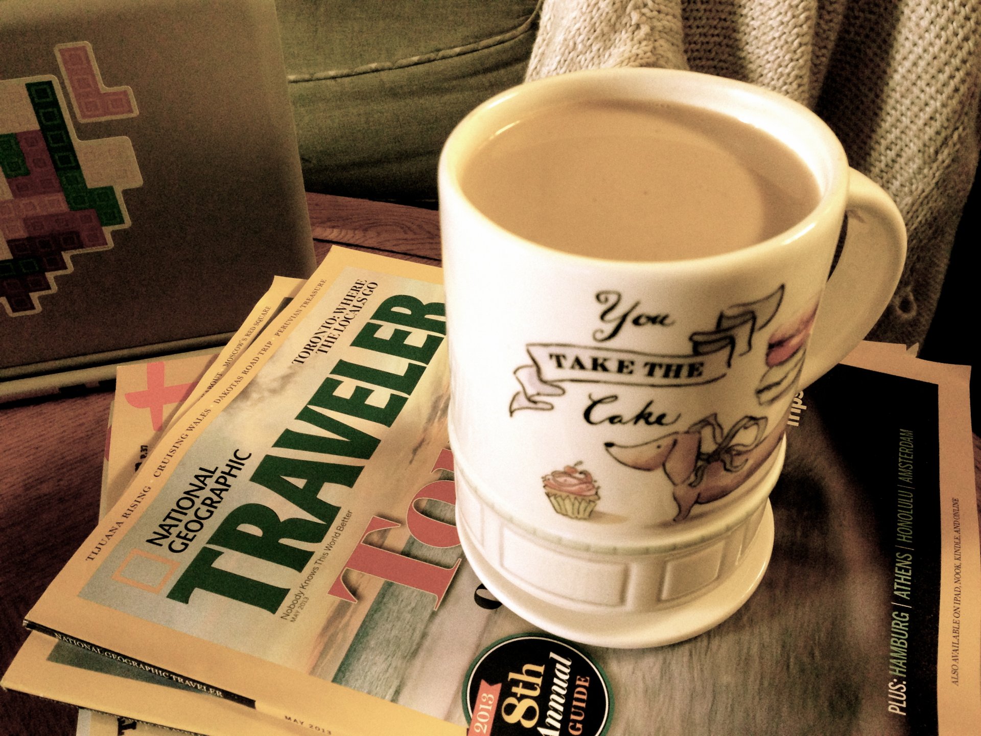 Kubek latte stoi na magazynach