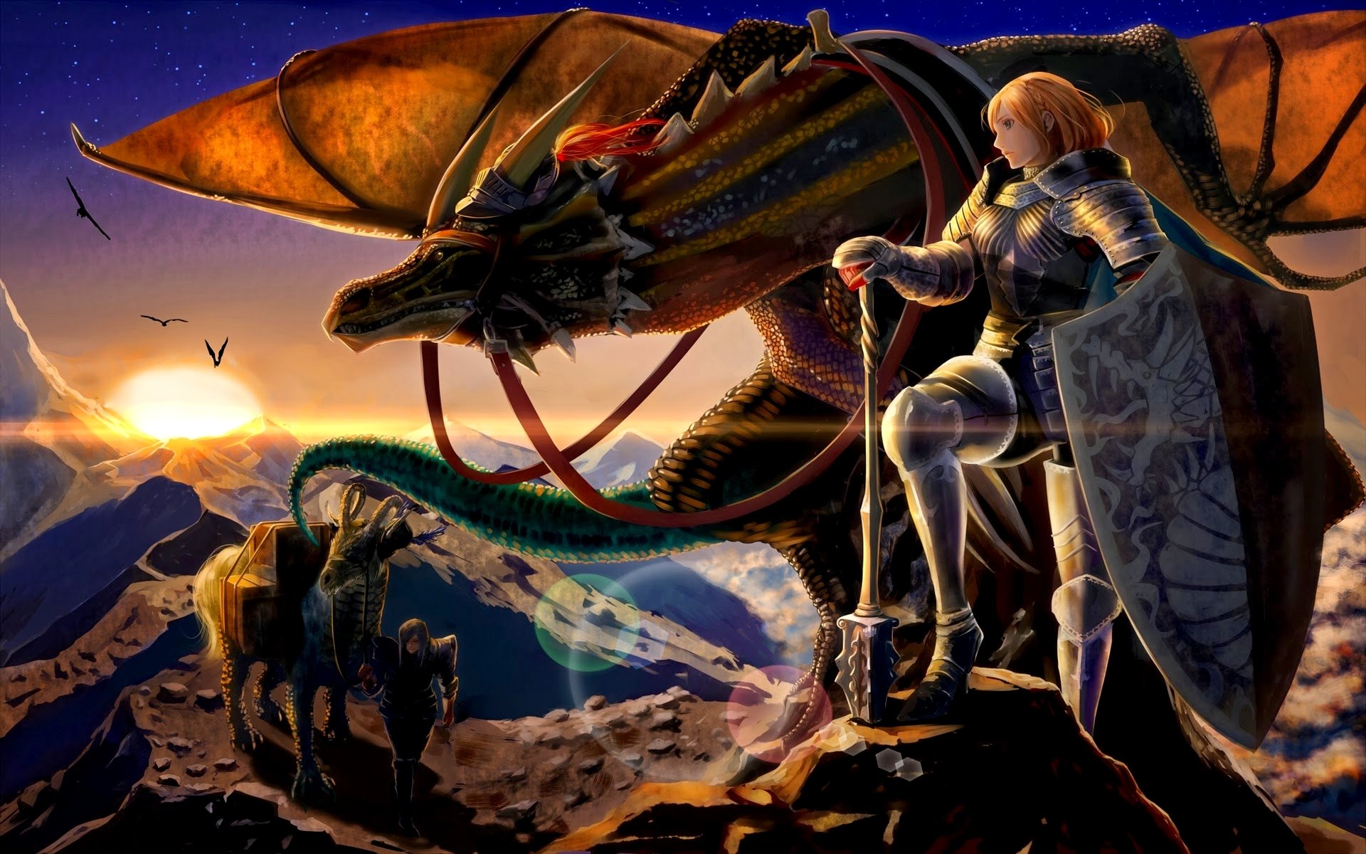 Wojownik ze Zbroją ze smokiem o zachodzie słońca