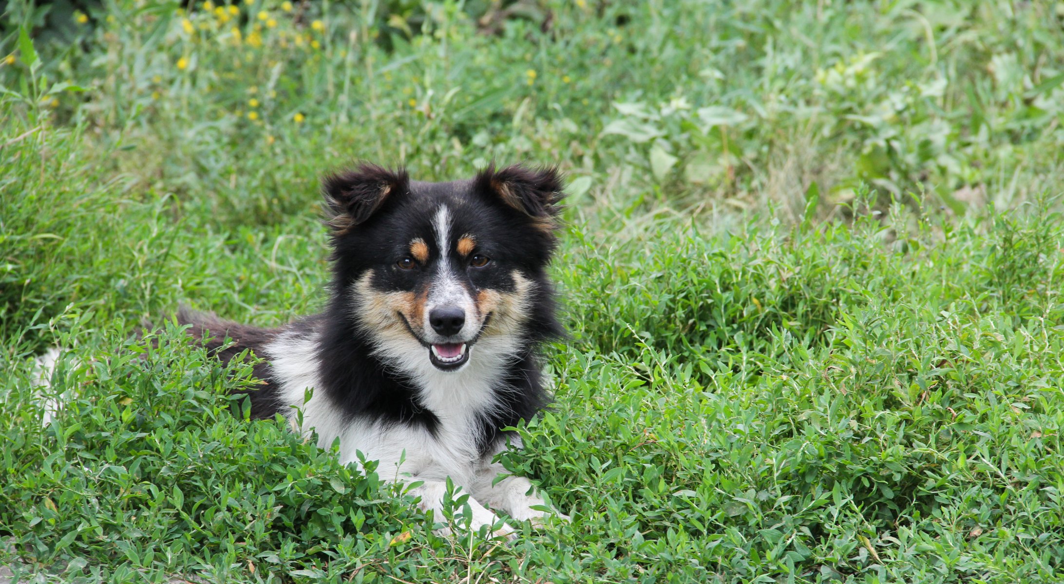 Pies patrzy na właściciela, trzymając piłkę w zębach
