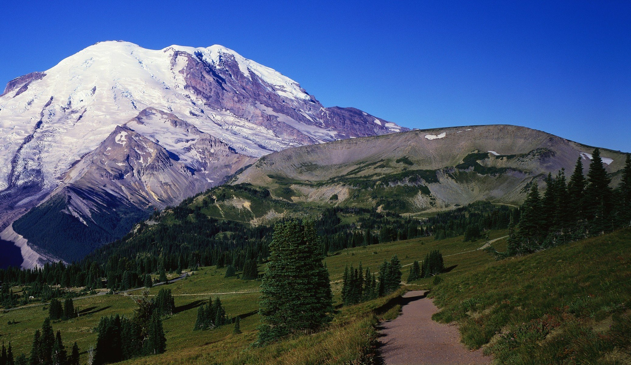 Śnieżna Góra i droga z drzewami prowadząca do niej
