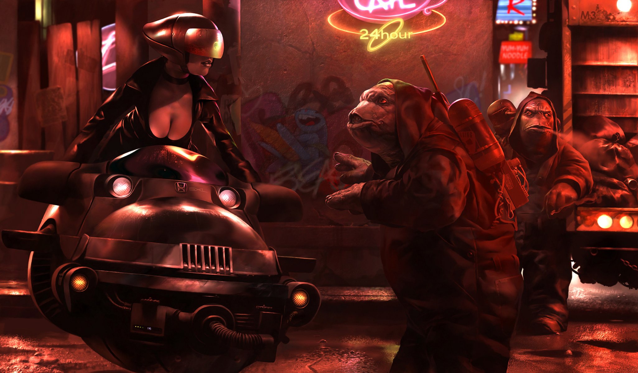 Futurystyczny obraz dziewczyny na motocyklu i potworaFuturystyczny obraz dziewczyny na motocyklu i potwora