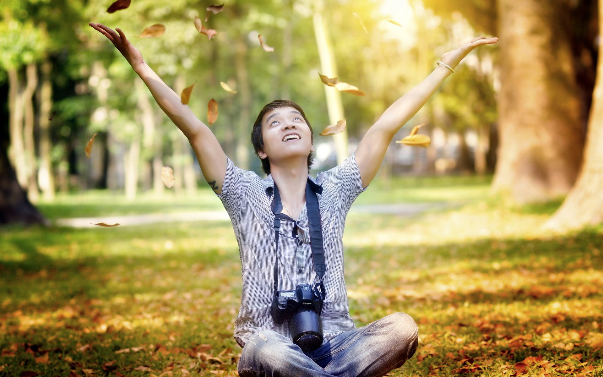 Siedzący na powalonym drzewie w jesiennym lesie facetSiedzący na powalonym drzewie w jesiennym lesie facet