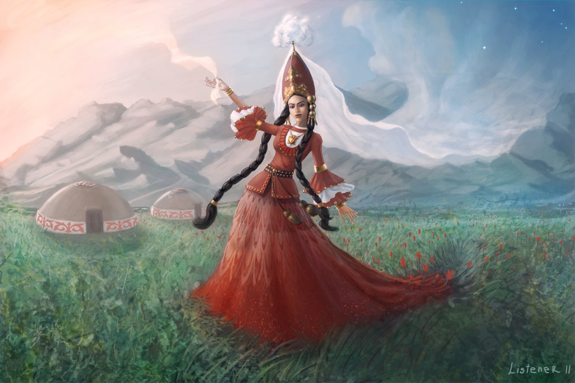 Kozak w stroju narodowym tańczy u jurty