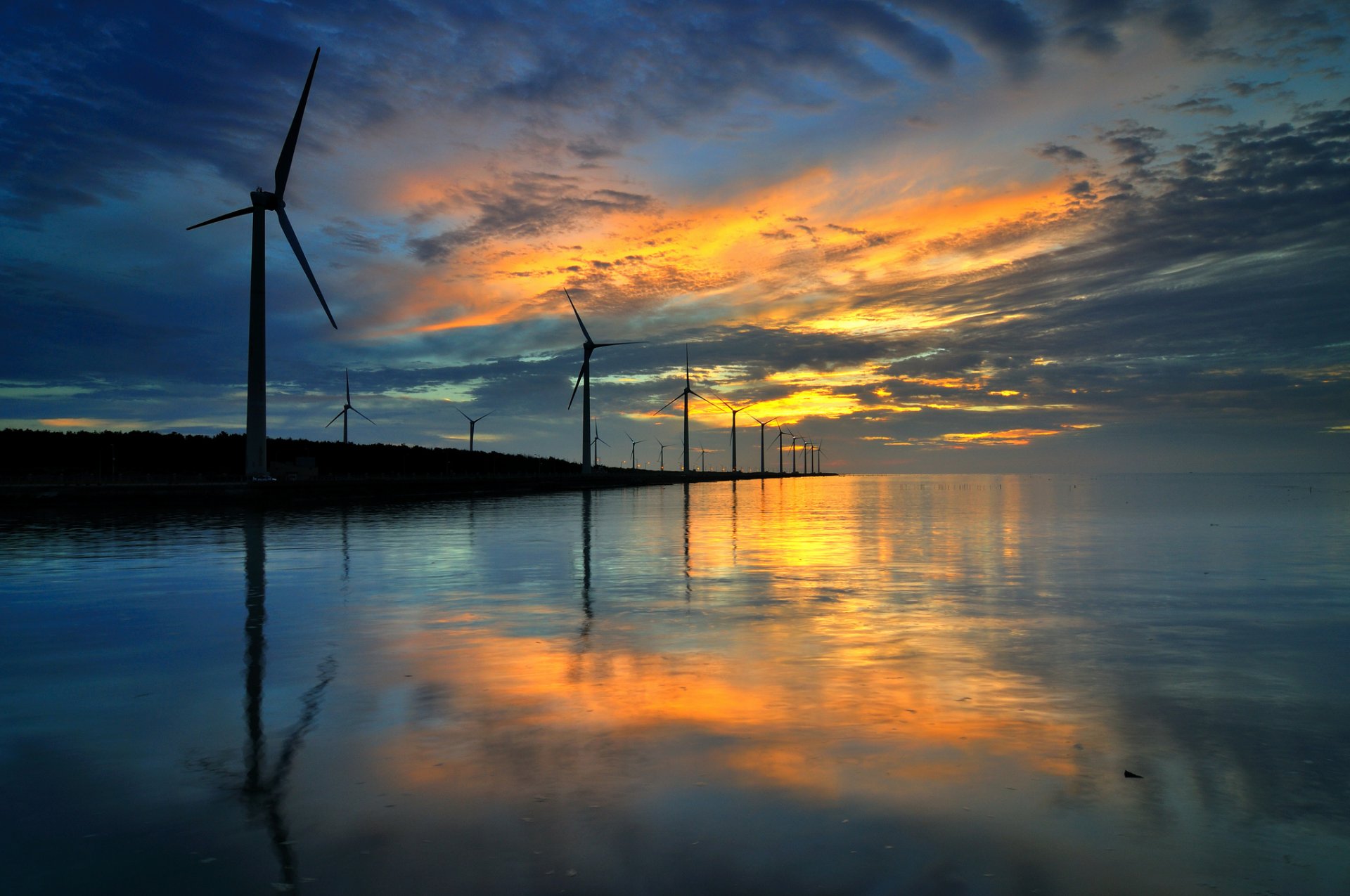 Zmierzchowe Wiatraki na tle wody