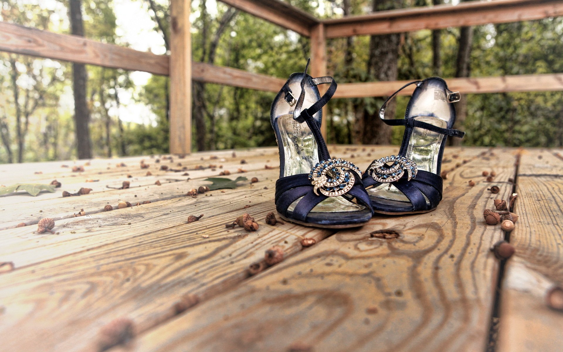 Damskie sandały wieczorowe na wiejskim tarasie