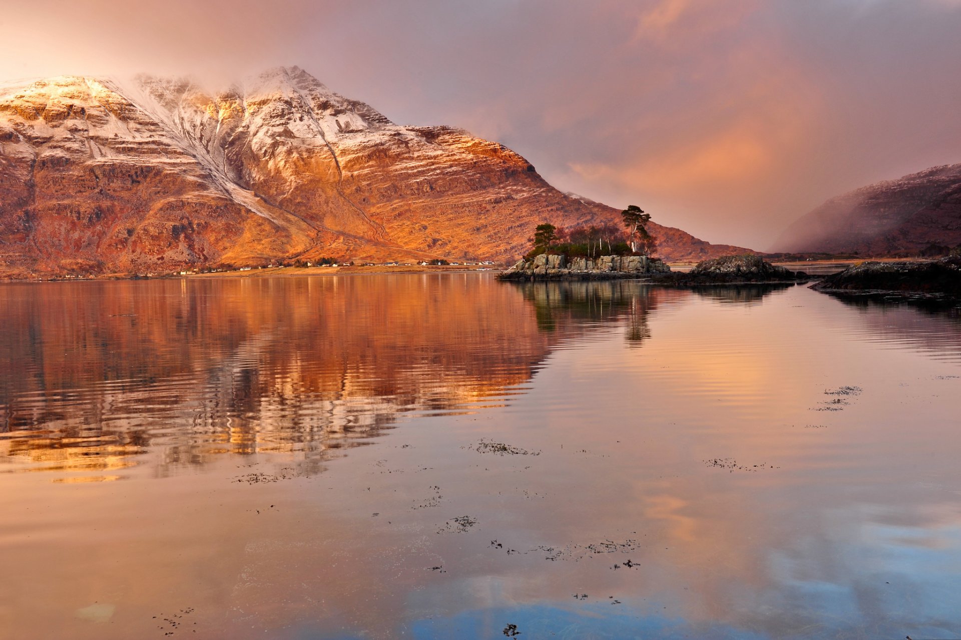Odbicie zachodu Słońca w wodzie na tle pięknych łubinów