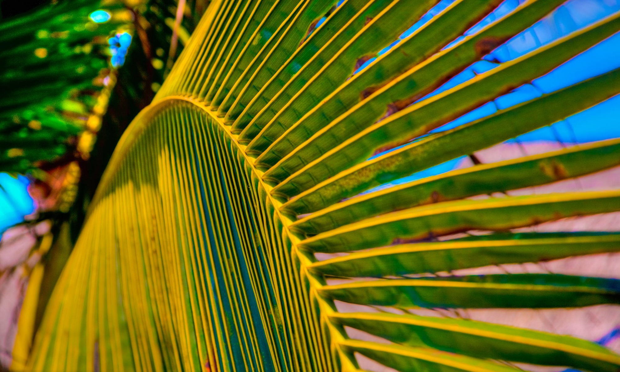 Palma rosnąca na wybrzeżu oceanu w promieniach zachodu Słońca