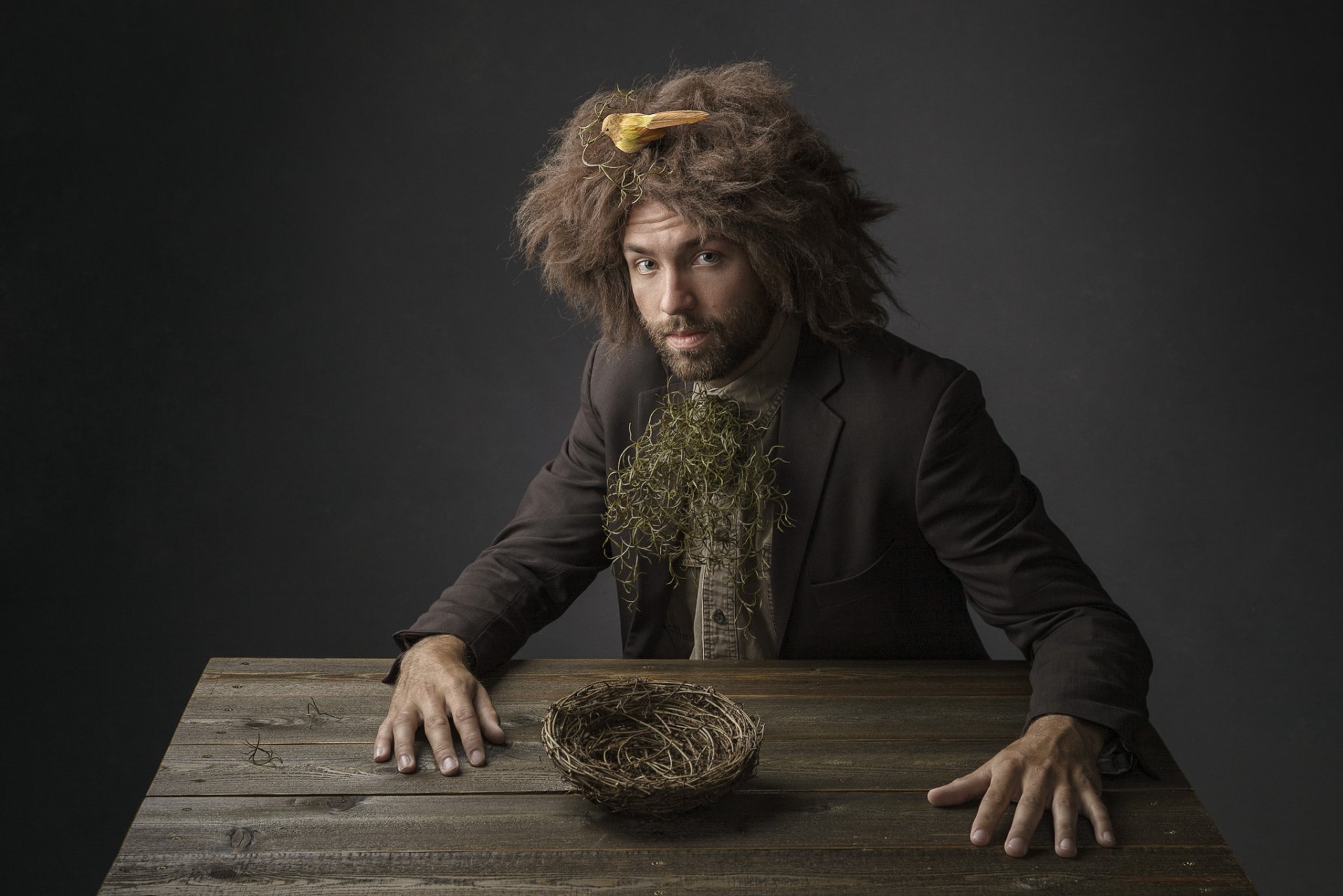Niezwykle ubrany mężczyzna siedzący przy drewnianym stole