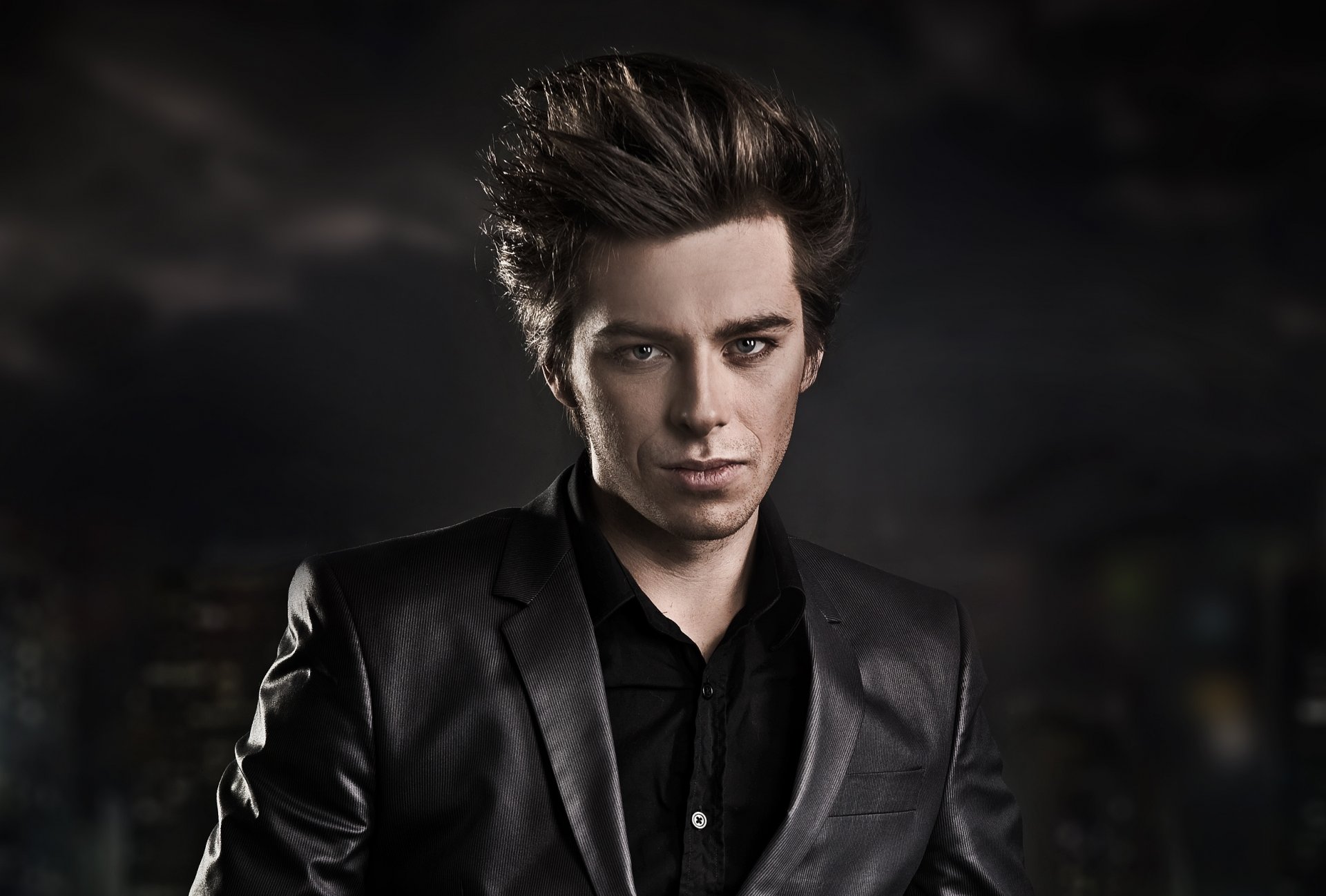 Aktor, model i muzyk jamie dornan w białej koszulce, niebieskich spodniach i czarnych tenisówkach siedzi na drewnianym krześle z skrzyżowanymi palcami i lewą nogą na prawym kolanie na czarnym tleAktor, model i muzyk Jamie Dornan w białej koszulce, niebieskich spodniach i czarnych tenisówkach siedzi na drewnianym krześle z skrzyżowanymi palcami i lewą nogą na prawym kolanie na czarnym tle
