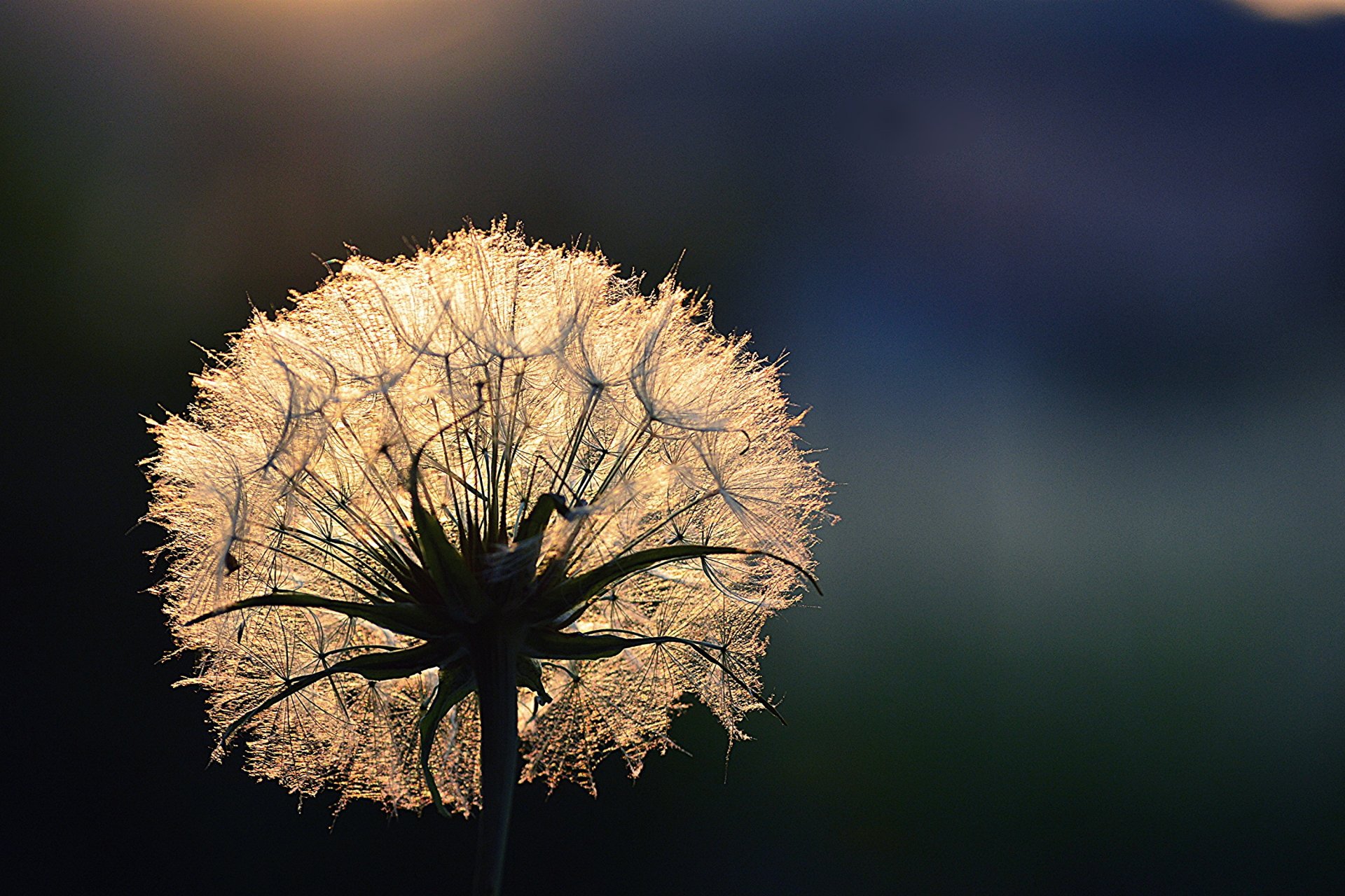 Puszysty mniszek lekarski jest pięknie oświetlony promieniami słońca