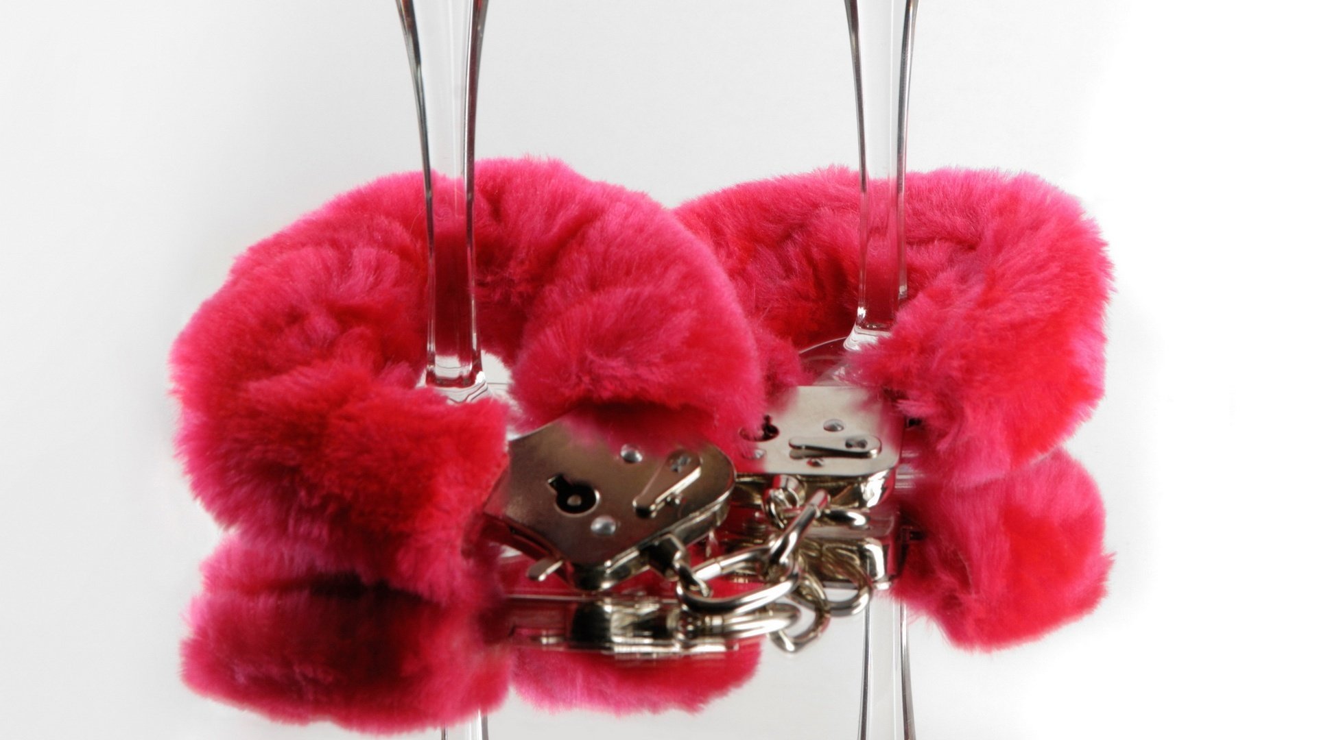 Kajdanki z czerwonym futrem przypięte do nóżek kieliszków na białym tleKajdanki z czerwonym futrem przypięte do nóżek kieliszków na białym tle
