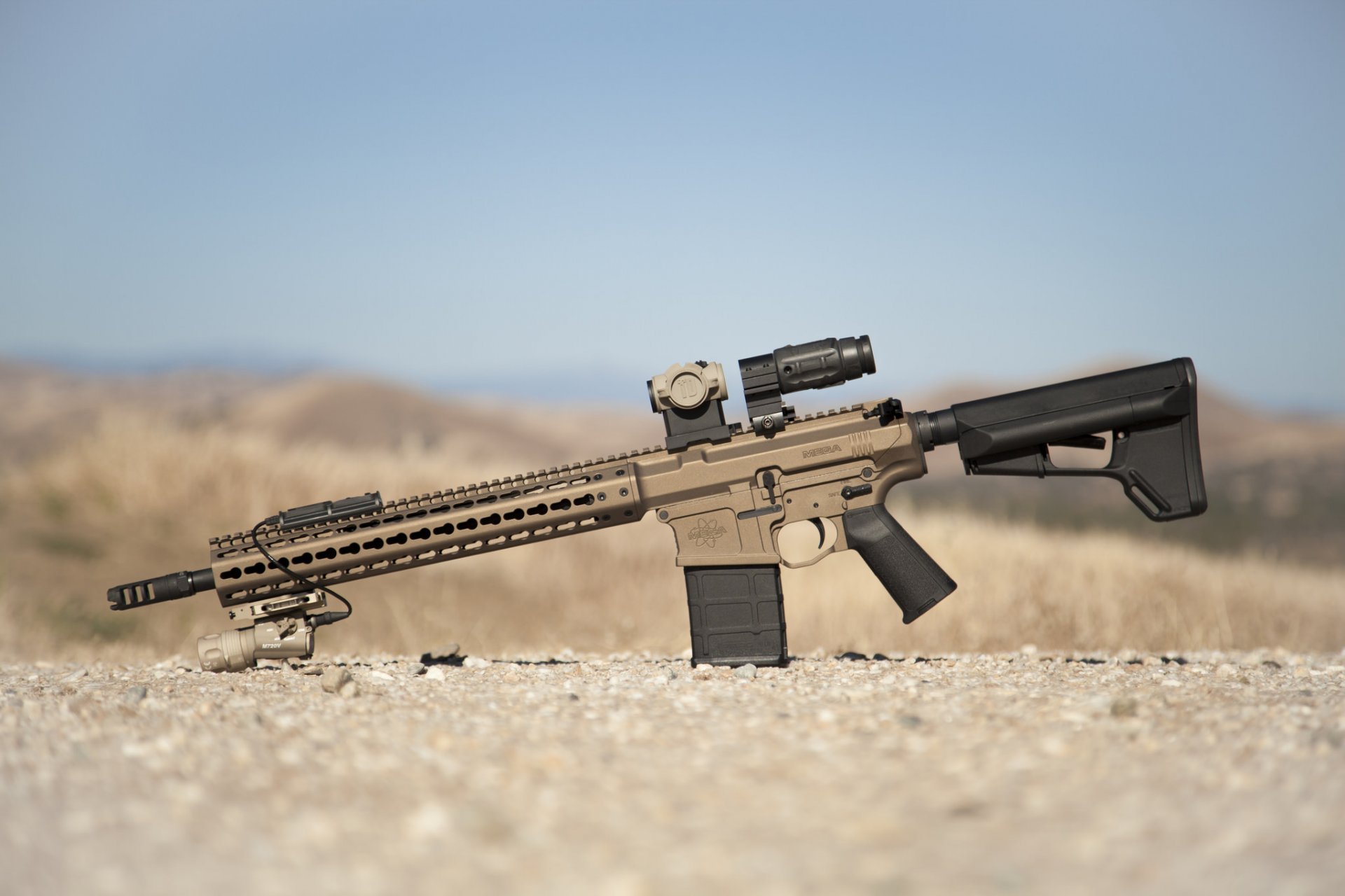 Czarny Karabin maszynowy z lunetą i kamizelką kuloodporną