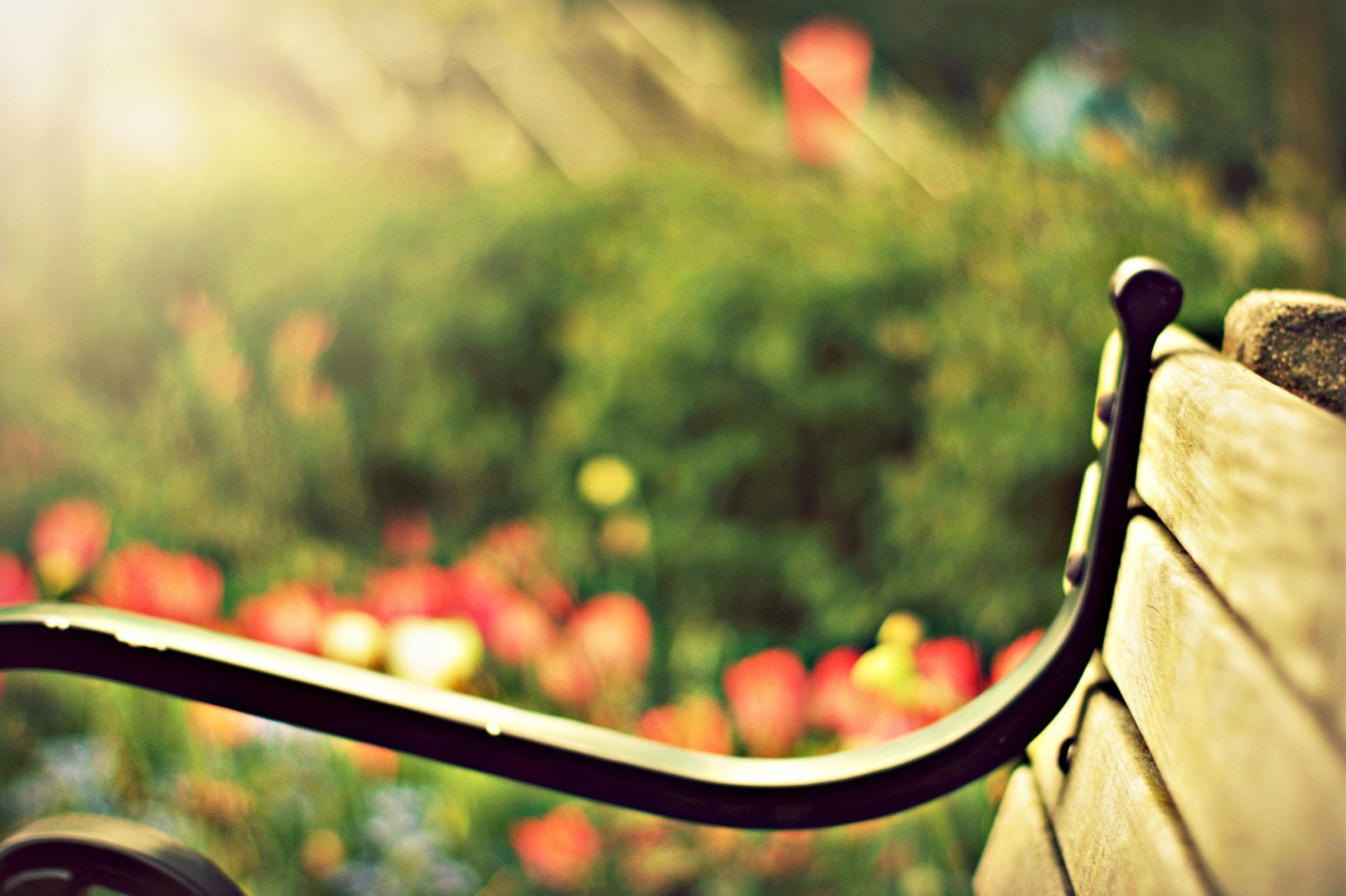 Ławka na tle kwiatów i słońca
