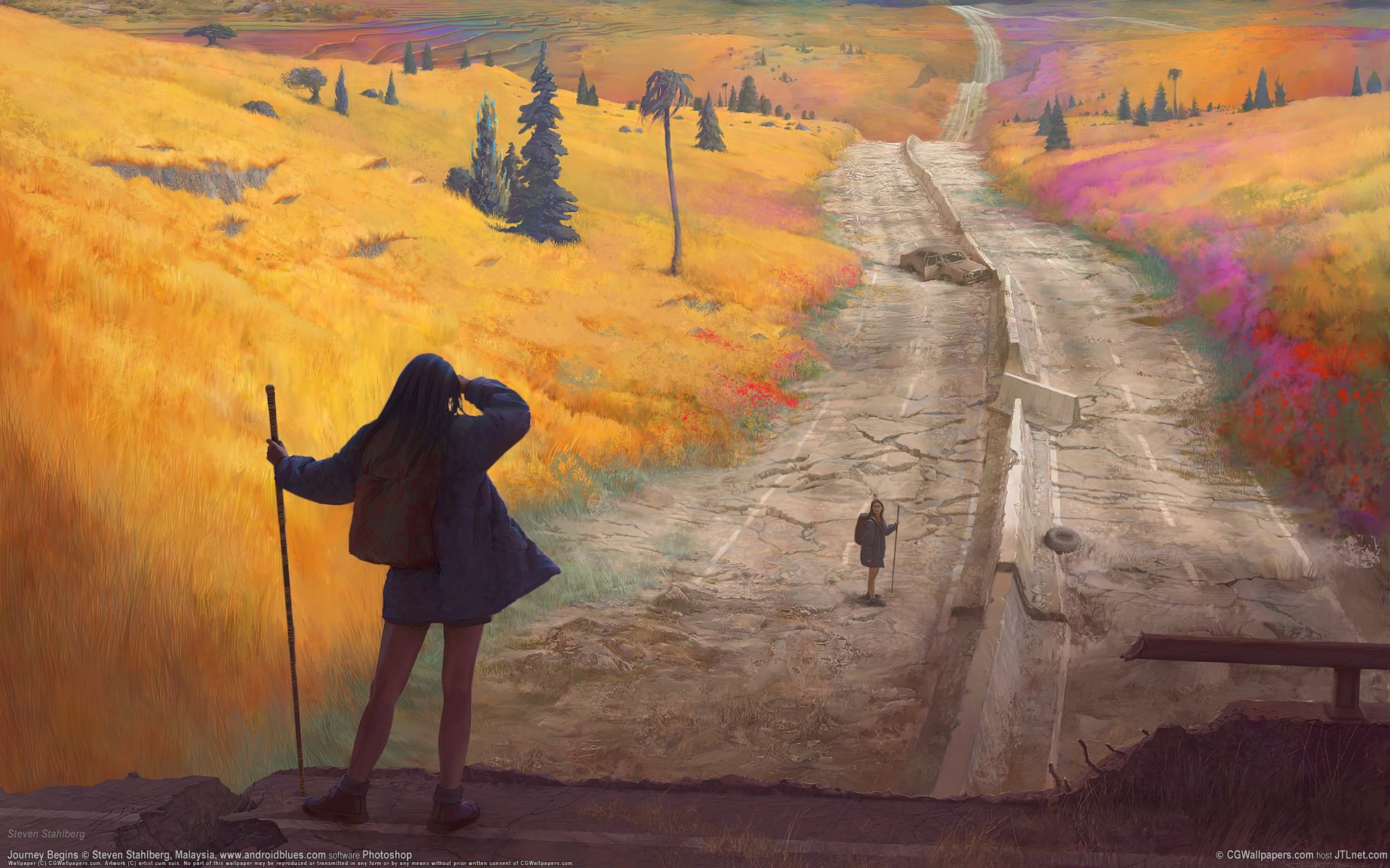 Rysowanie dziewcząt w ciemnych ubraniach na dużej postapokaliptycznej drodze