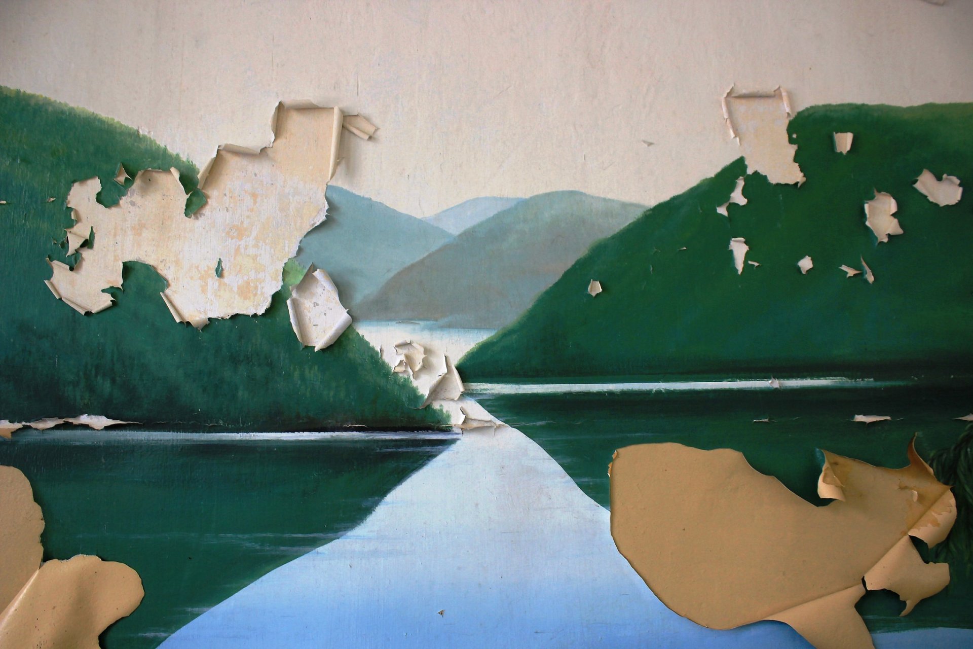 Zimne niebieskie wzgórza i zamarznięta rzeka na tle ciepłego, słonecznego śwituZimne niebieskie wzgórza i Zamarznięta rzeka na tle ciepłego, słonecznego świtu