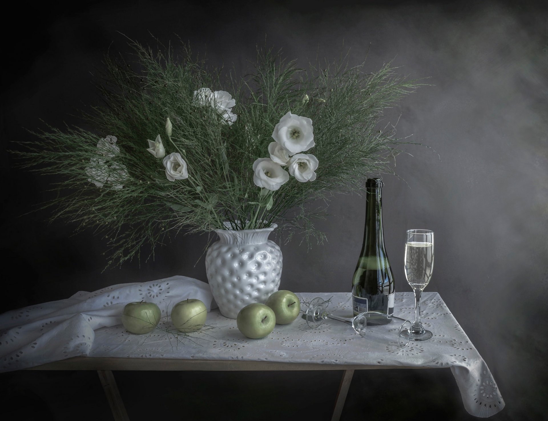 Noworoczna Martwa natura z kwiatami, jabłkami i szampanem