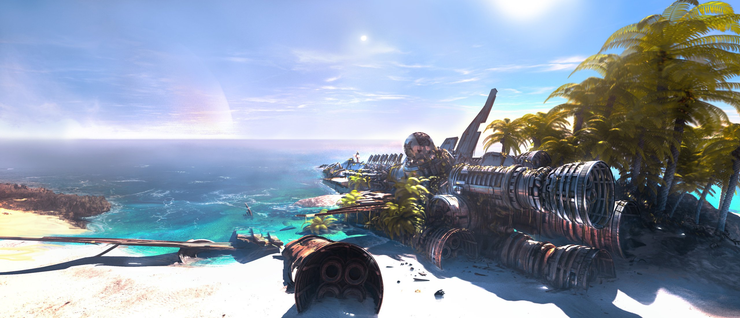 Sztuka katastrofy statku kosmicznego na tle spokojnego morza i piaszczystego brzegu