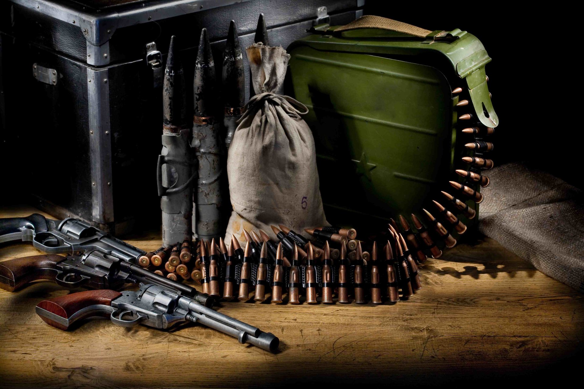 Rewolwery, pistolety, amunicja i torba stoją obok skrzyniRewolwery, pistolety, amunicja i torba stoją obok skrzyni
