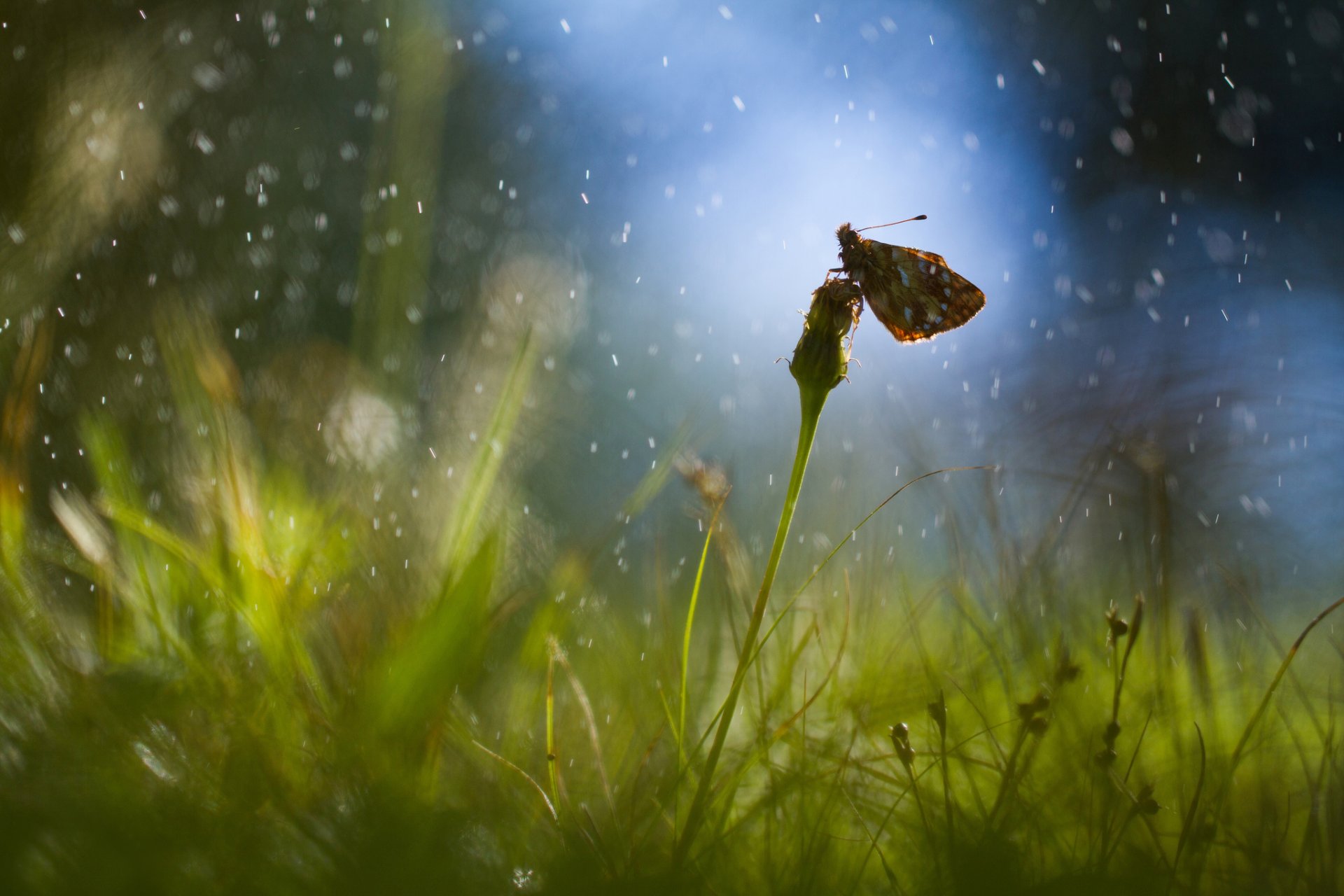 Motyl na mniszka lekarskiego z blaskiem deszczu w trawieMotyl na mniszka lekarskiego z blaskiem deszczu w trawie