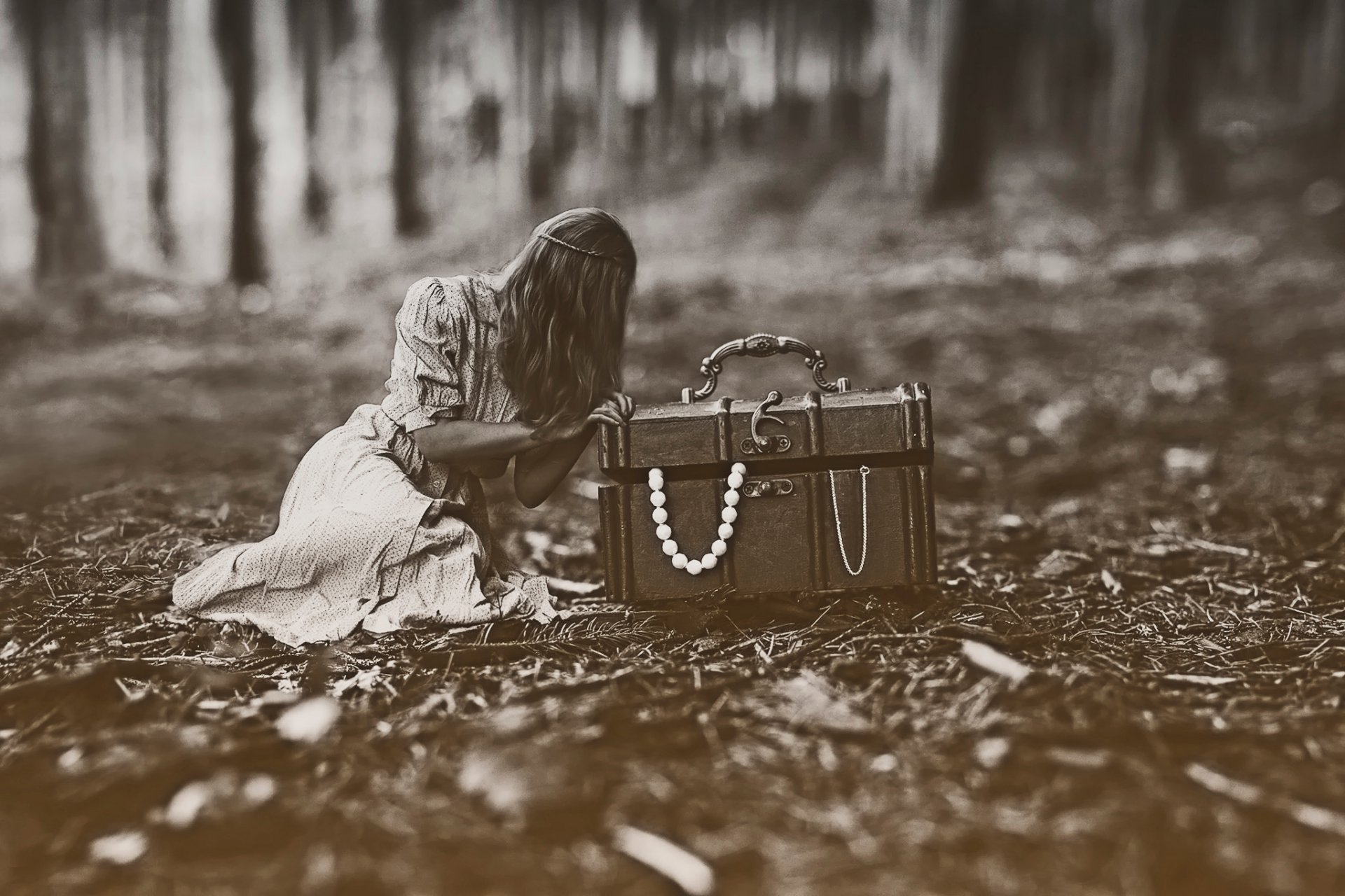 Dziewczyna w pięknej sukience stoi plecami w lesieDziewczyna w pięknej sukience stoi plecami w lesie
