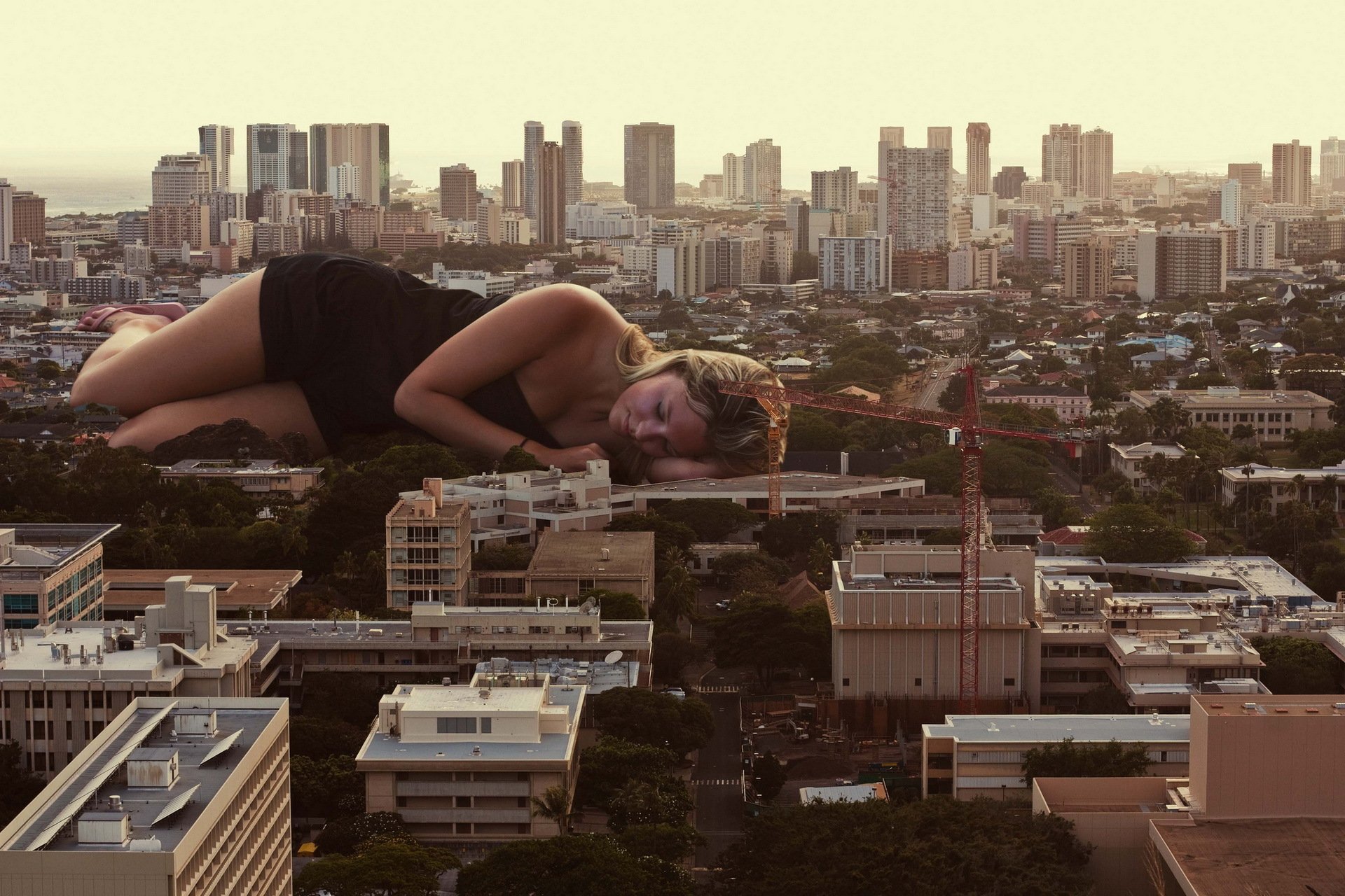 Dziewczyna-olbrzym śpi na ulicach miasta