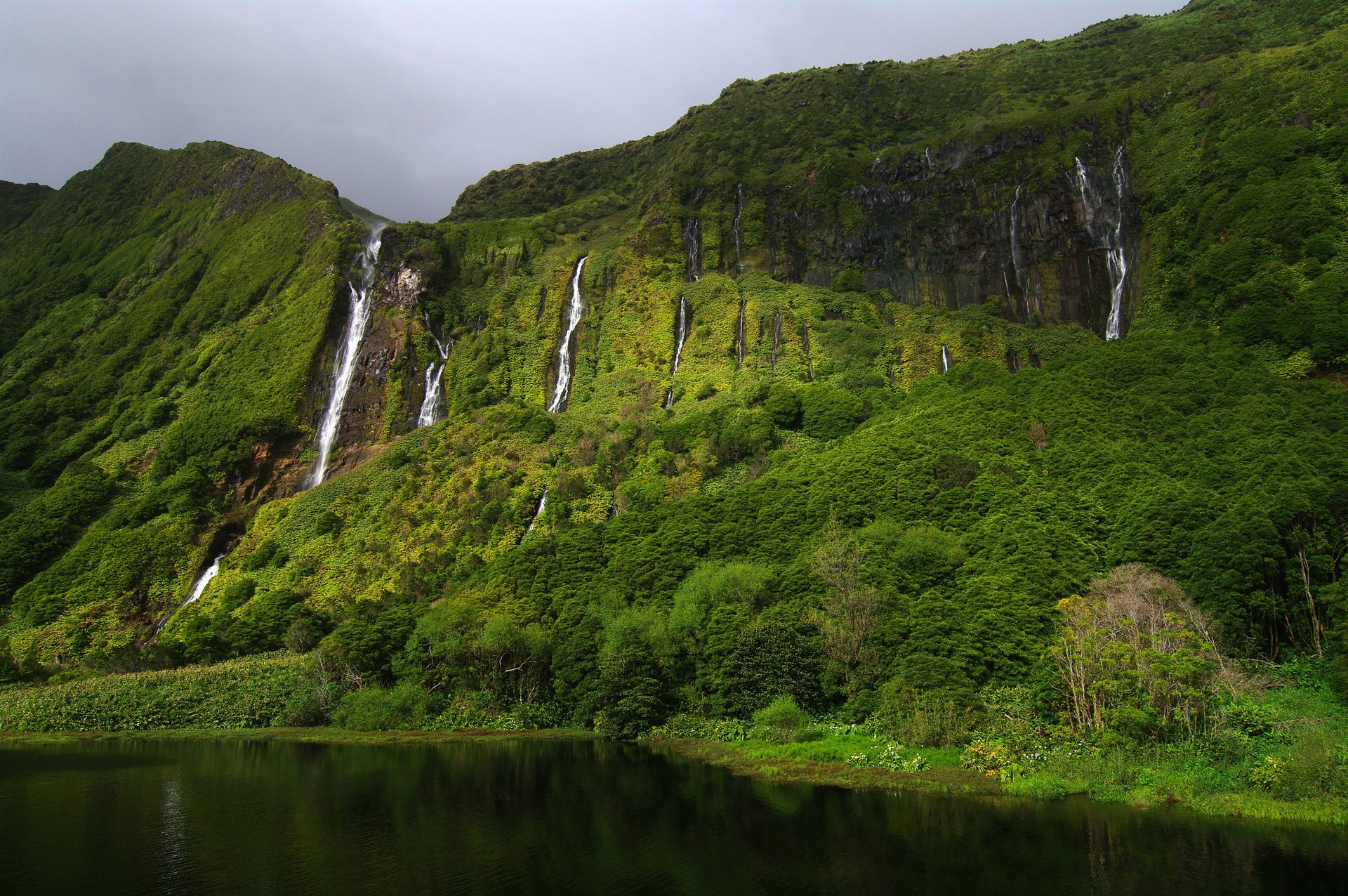 Krajobraz przedstawiający zielone góry i wodospady