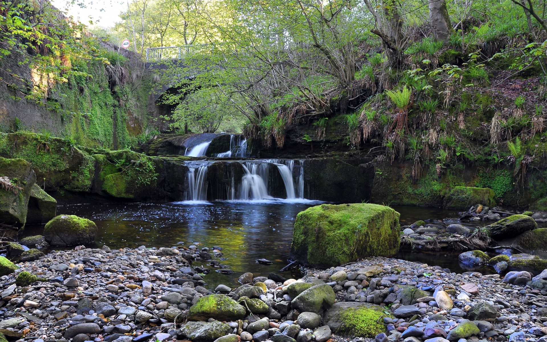 Lejący się wodospad na tle jesiennych kolorowych liściLejący się wodospad na tle jesiennych kolorowych liści