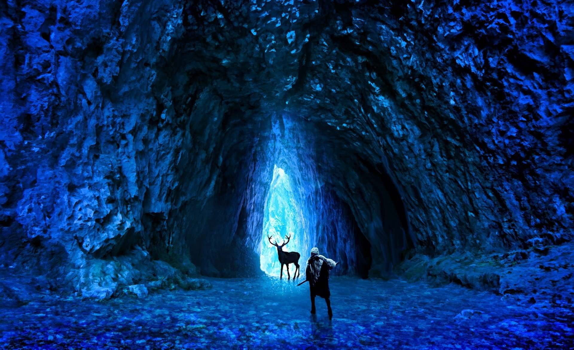 Dziewczyna z kandelabrem w ręku zagląda do magicznego lustra w ogromnej sali