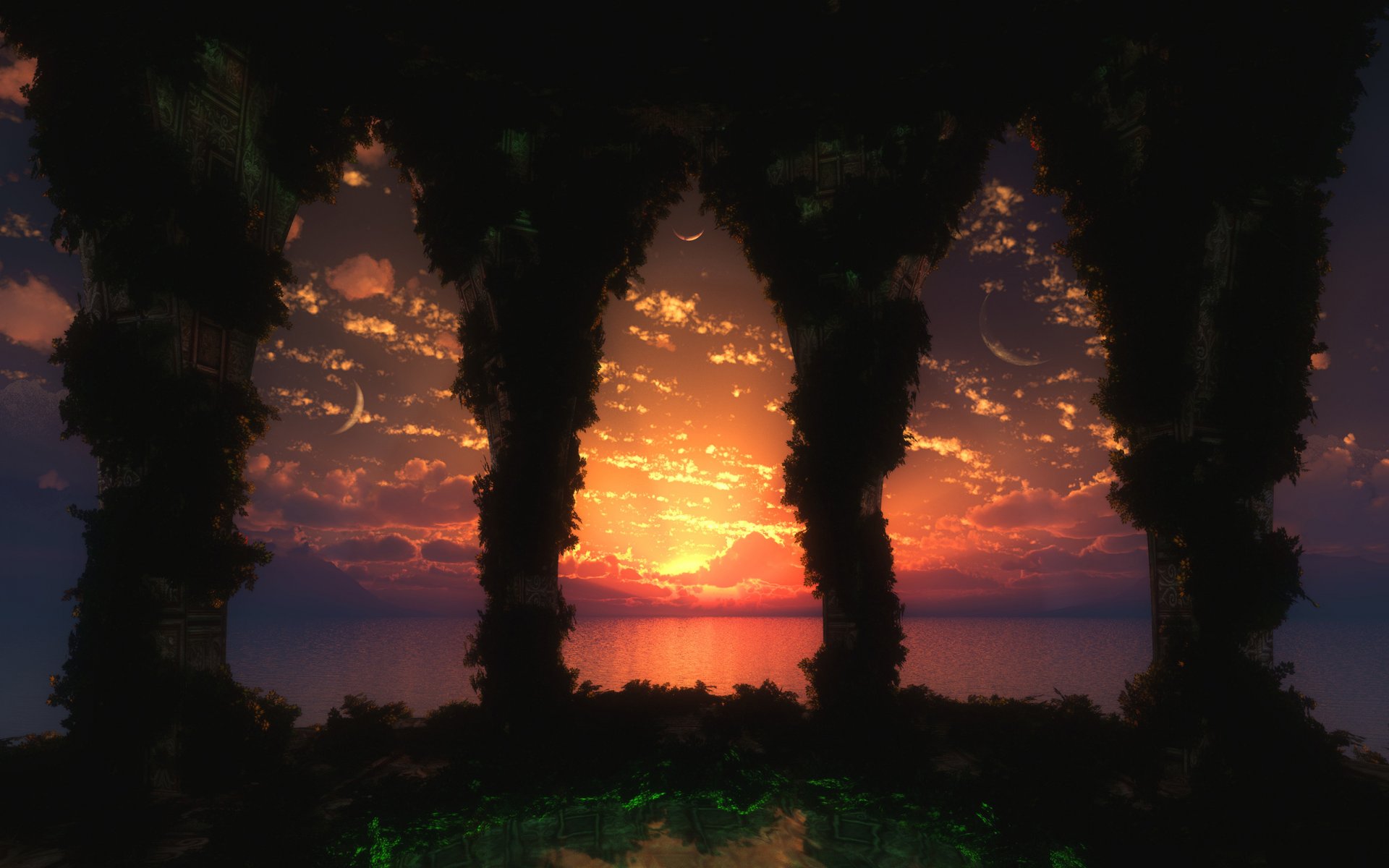 Widok zachodu Słońca na morze w pobliżu kwartetu drzew
