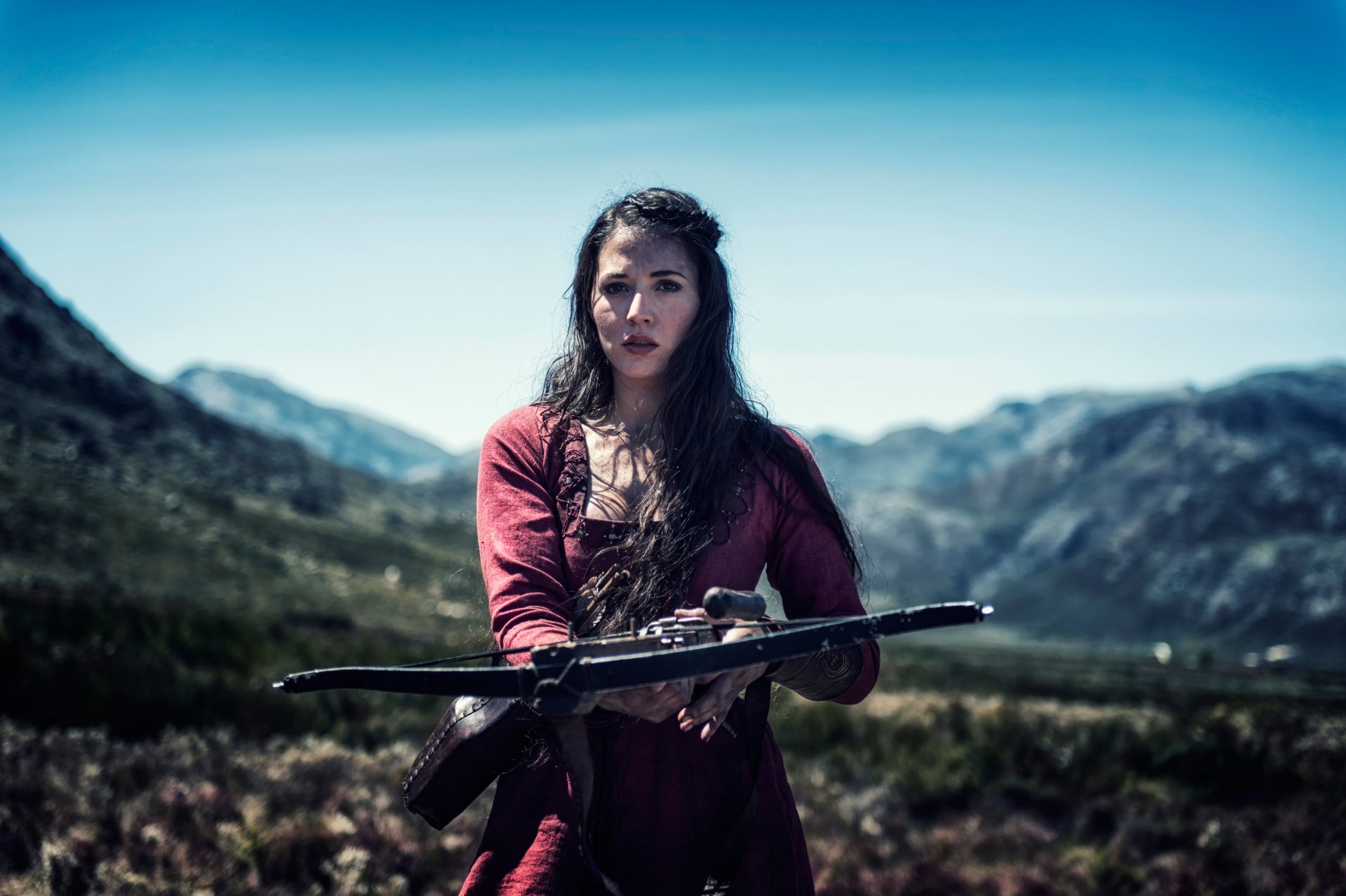 Dziewczyna z kokardą, wokół góry i pogodny dzień