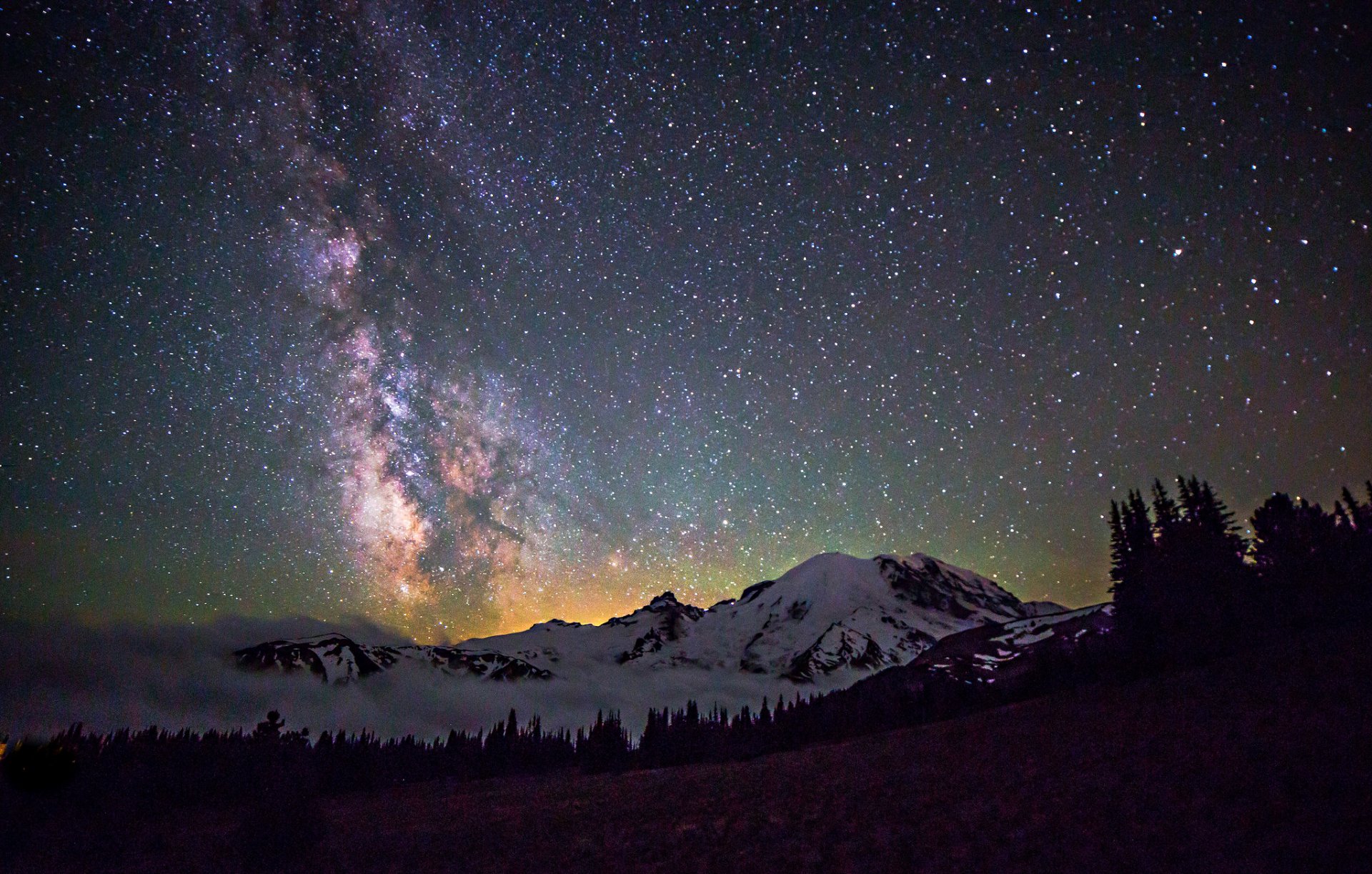 Gwiaździste niebo, góry w śniegu i droga Mleczna
