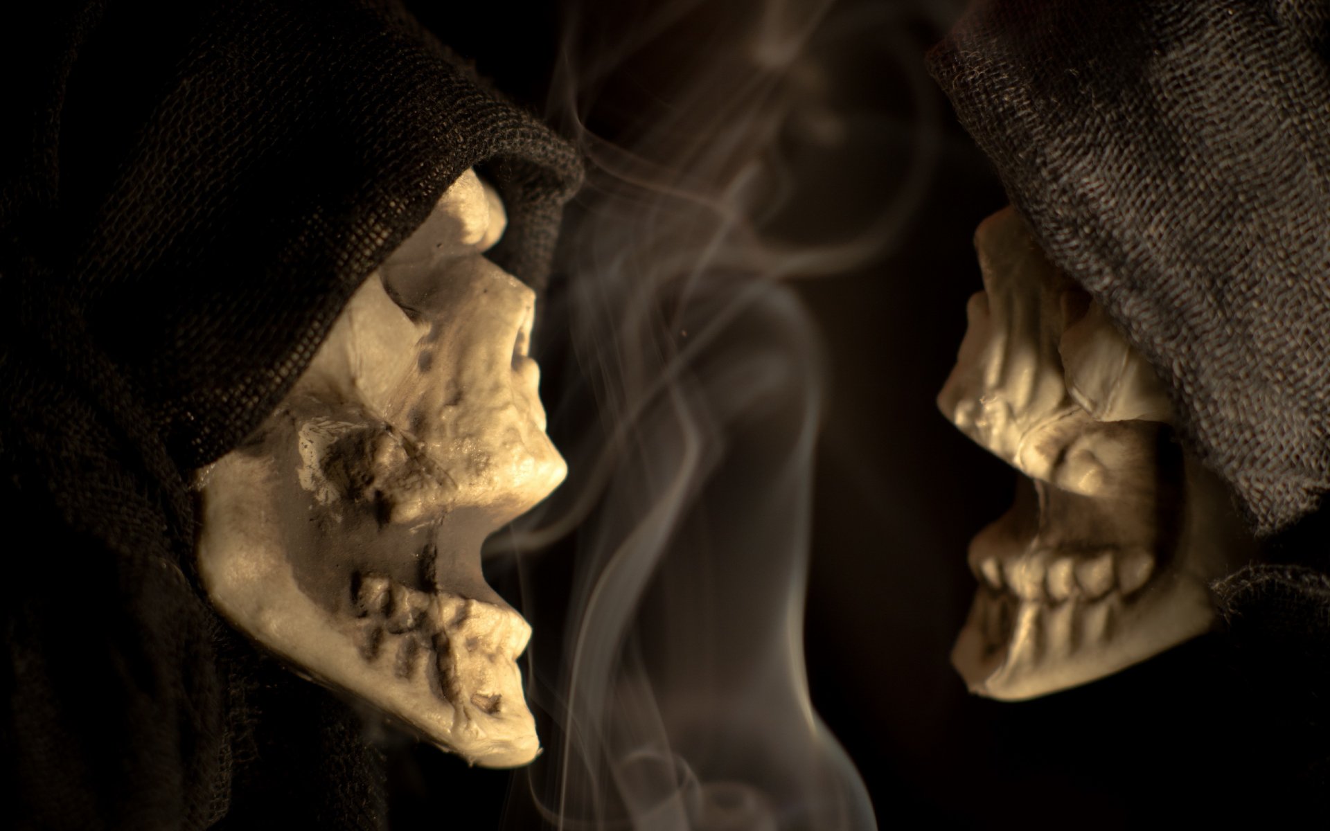 Mężczyzna w czarnym garniturze przy stole z czaszką